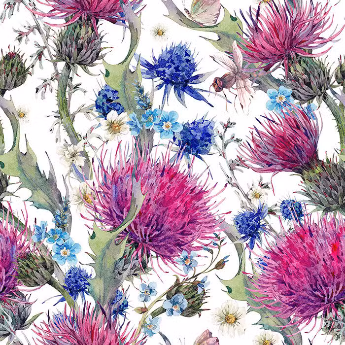 Tulip Vines by Canadian artist Sabina Maria bursts with expressive energy, bringing painterly florals to life in bold strokes of inky green, soft sage, and stormy blue. This hand-painted design mimics the fluidity of watercolour on paper, with layered tulip shapes and leafy vines flowing organically across a crisp white background.
