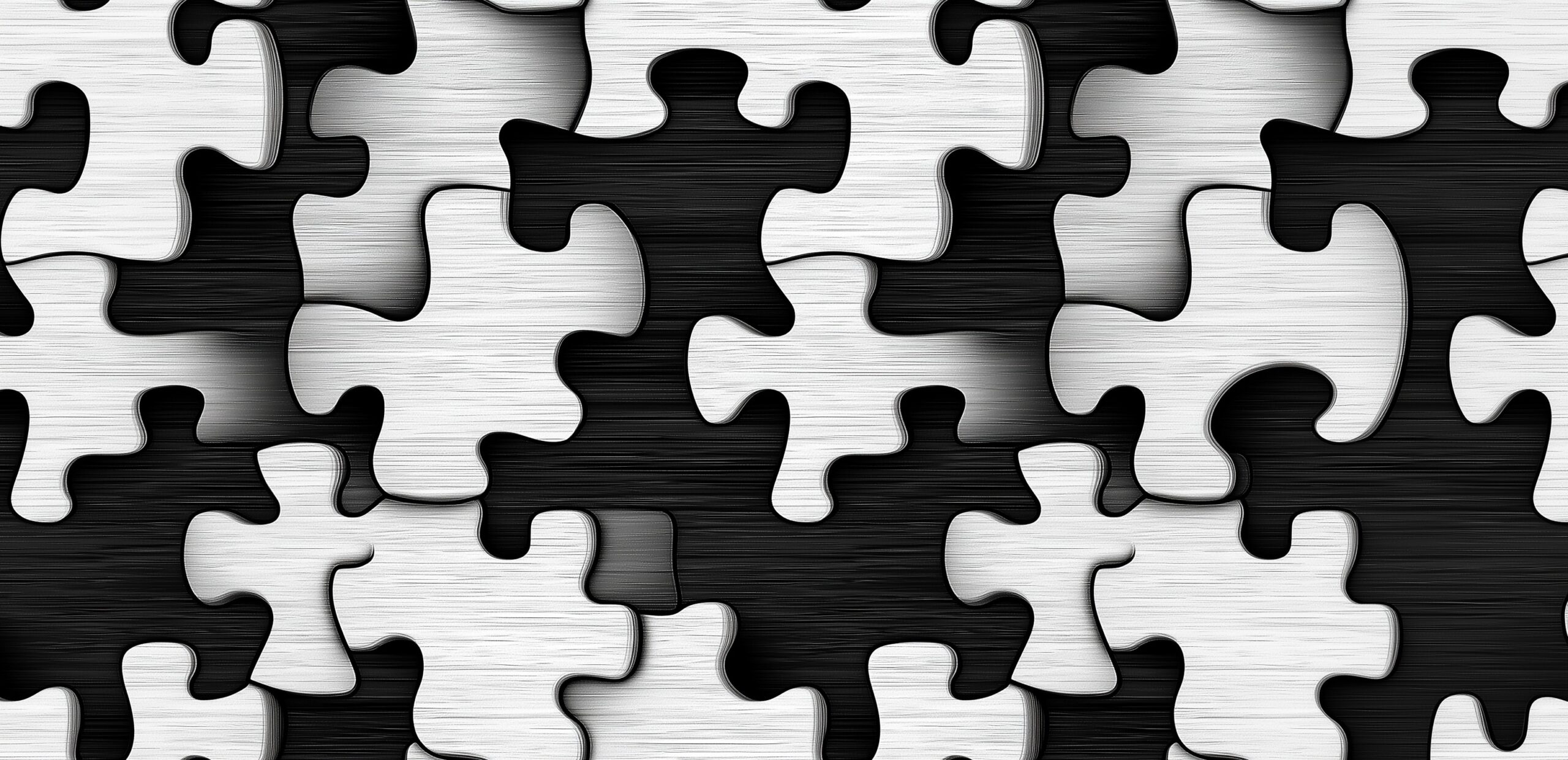 Rendered in a sophisticated monochrome palette, the mural plays masterfully with contrast. The prominent puzzle shapes are finished in a bright, brushed silver-white texture that catches the light, while the “missing” pieces reveal a dark, textured charcoal background mimicking deep brushed metal or etched wood.