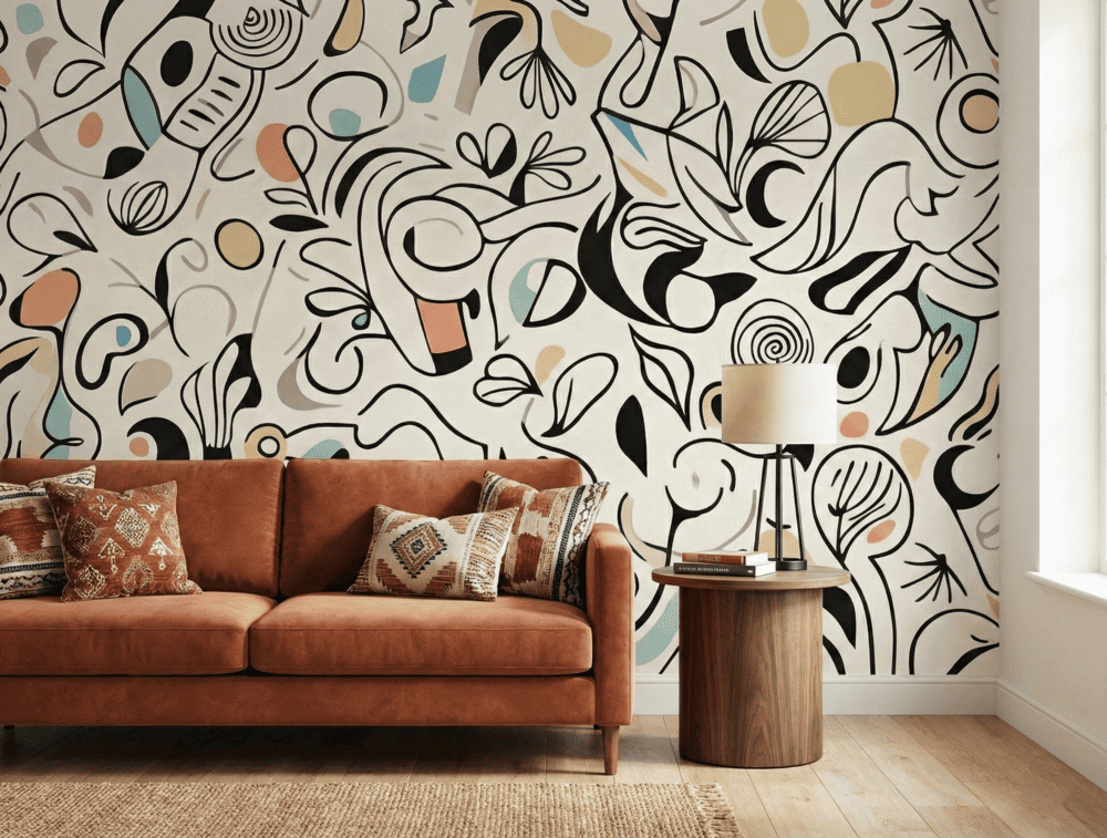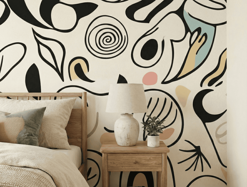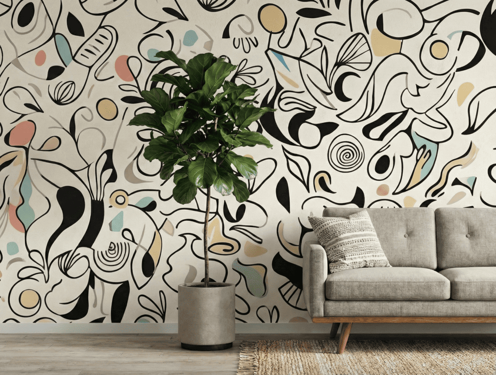 Transform your walls into a gallery of modern art with the Abstract Whimsy Mural. This captivating design embraces the “doodle” aesthetic, featuring a continuous flow of organic black lines that curve and dance across the surface. The intricate line work suggests vague botanical forms, swirls, and abstract figures, encouraging the eye to wander and the imagination to play.