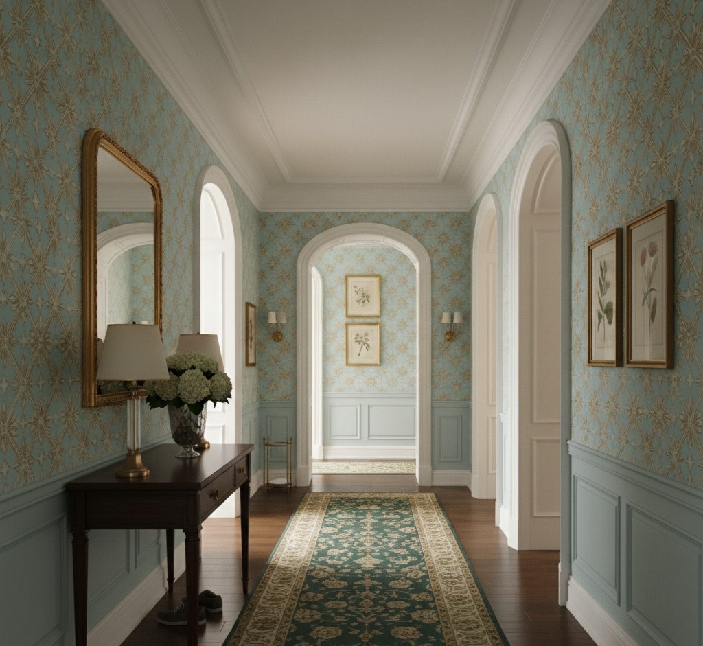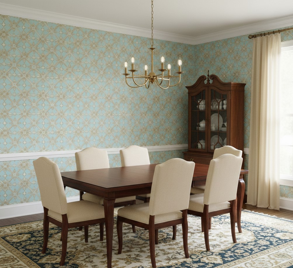Set against a crisp, soothing sky-blue backdrop, the geometric grid is softened by stylized floral starbursts placed at each intersection and within the diamond centers. The result is a harmonious balance of structure and ornamentation. This wallpaper is an impeccable choice for a bright and airy kitchen, a serene powder room, or a classic sunroom, adding a layer of texture and refined history to the space without feeling heavy.