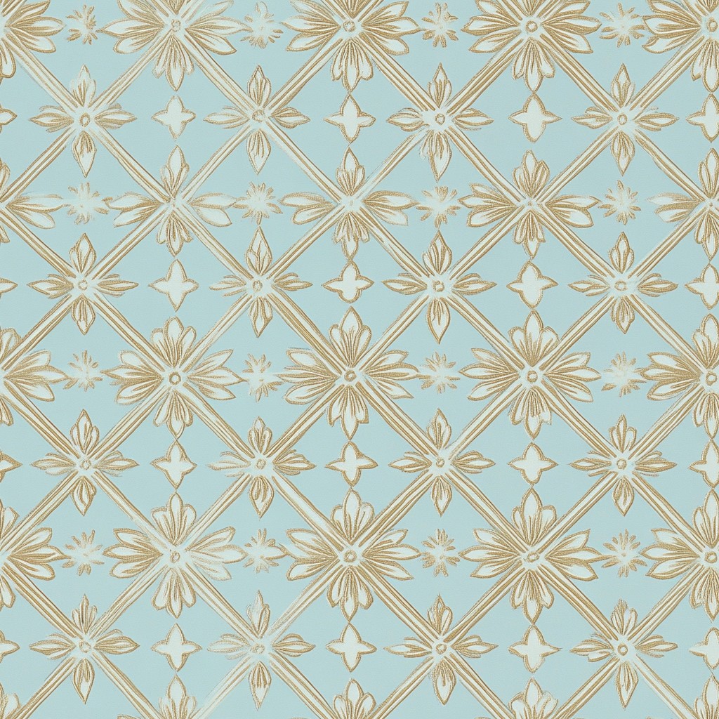 Bring a breath of fresh air and timeless elegance to your walls with the Azure Gilded Trellis Wallpaper. This sophisticated wall covering draws inspiration from antique tin ceilings and traditional ceramic tiles. The design is anchored by a structured diagonal lattice (trellis) rendered in warm, metallic-toned gold and tan strokes that mimic the look of gilded ironwork or architectural molding.