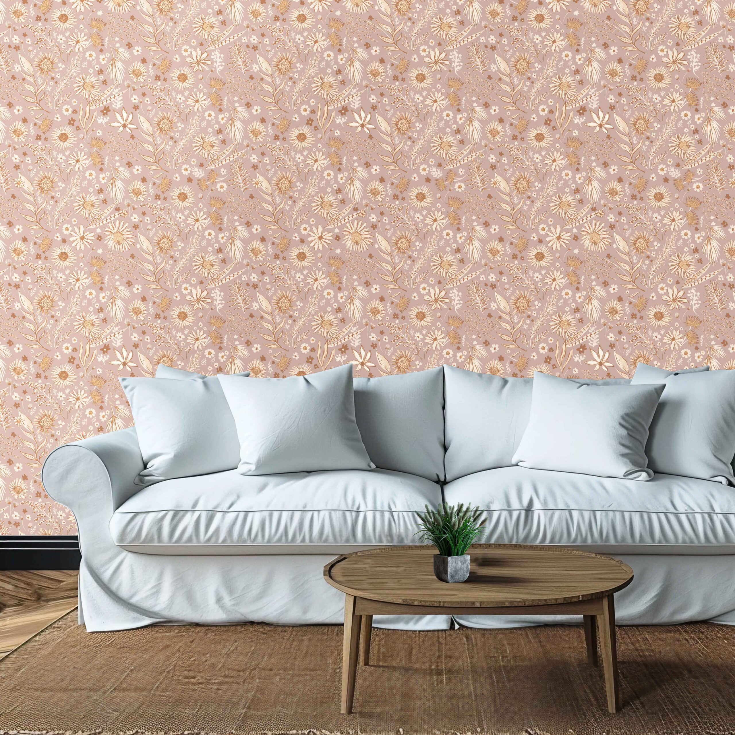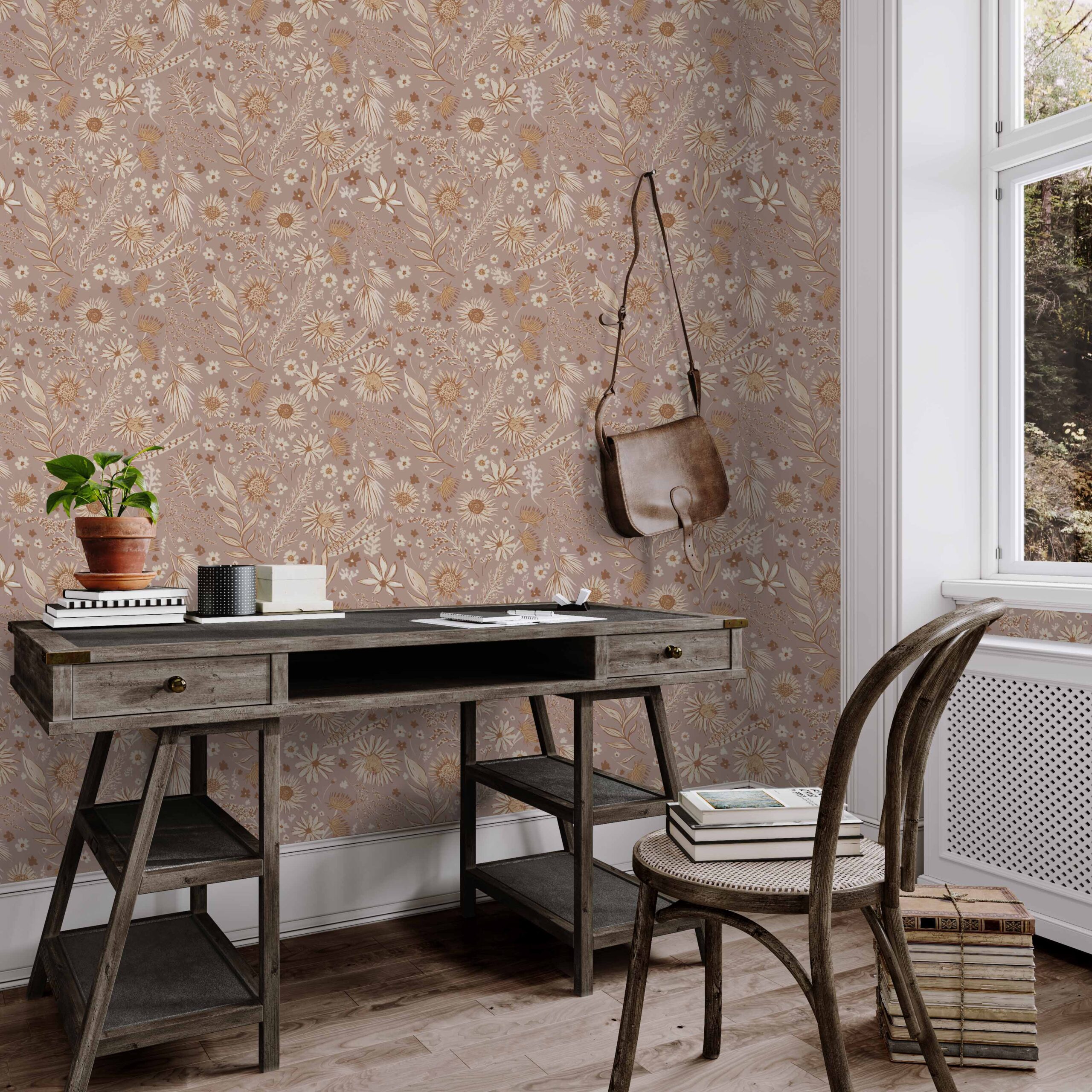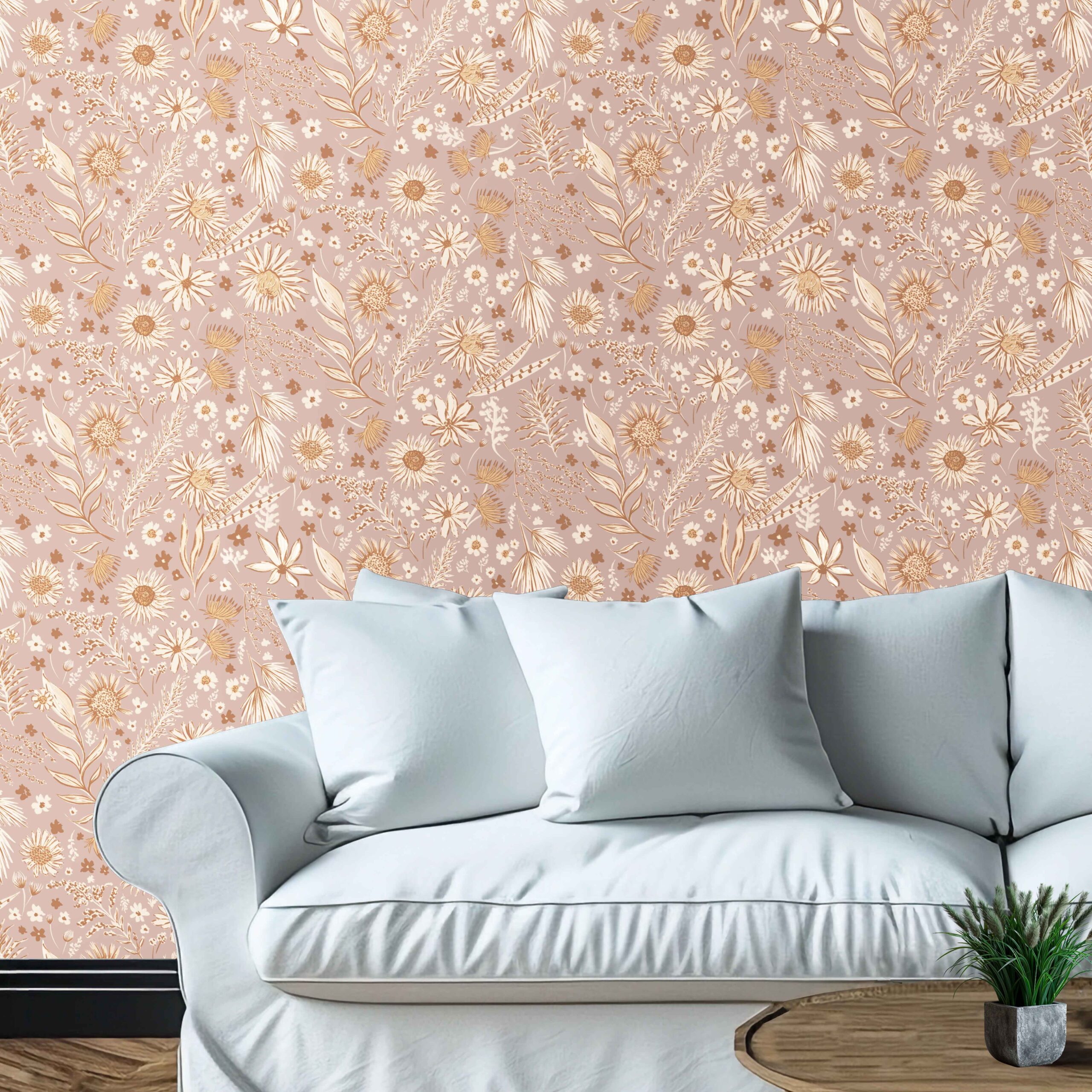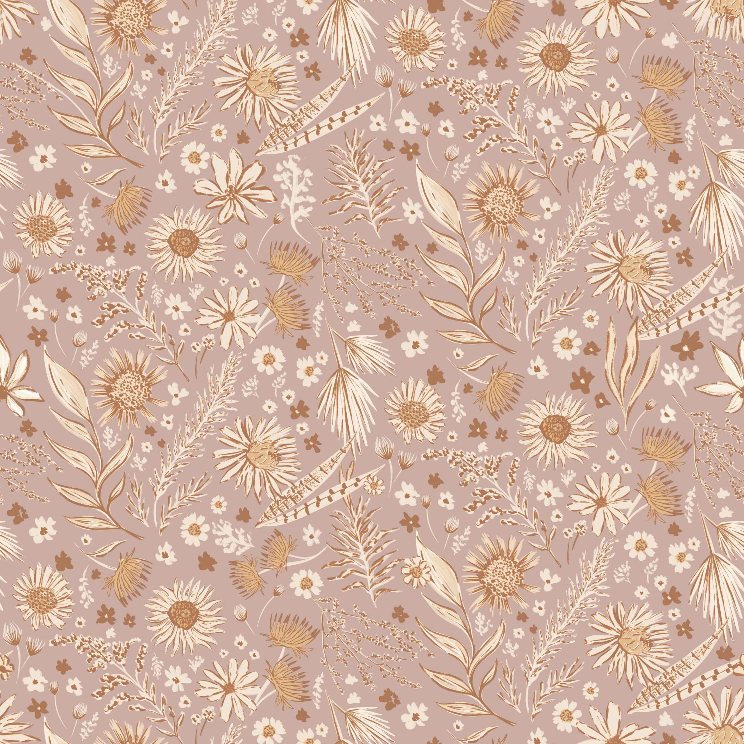 Bohemian Oasis in Rose Wallpaper – Whimsical Botanical Charm in a Soft Rose Hue – This peel and stick wallpaper radiates boho serenity with its hand-drawn floral motif in soft golden ochres layered over a dusty rose-pink background. Subtle and artistic, it’s perfect for nurseries, bedrooms, studios or any space that needs warmth and character. Printed on commercial-grade removable vinyl, it’s washable, repositionable, and renter-friendly—making your design dreams easy to achieve and just as easy to change.