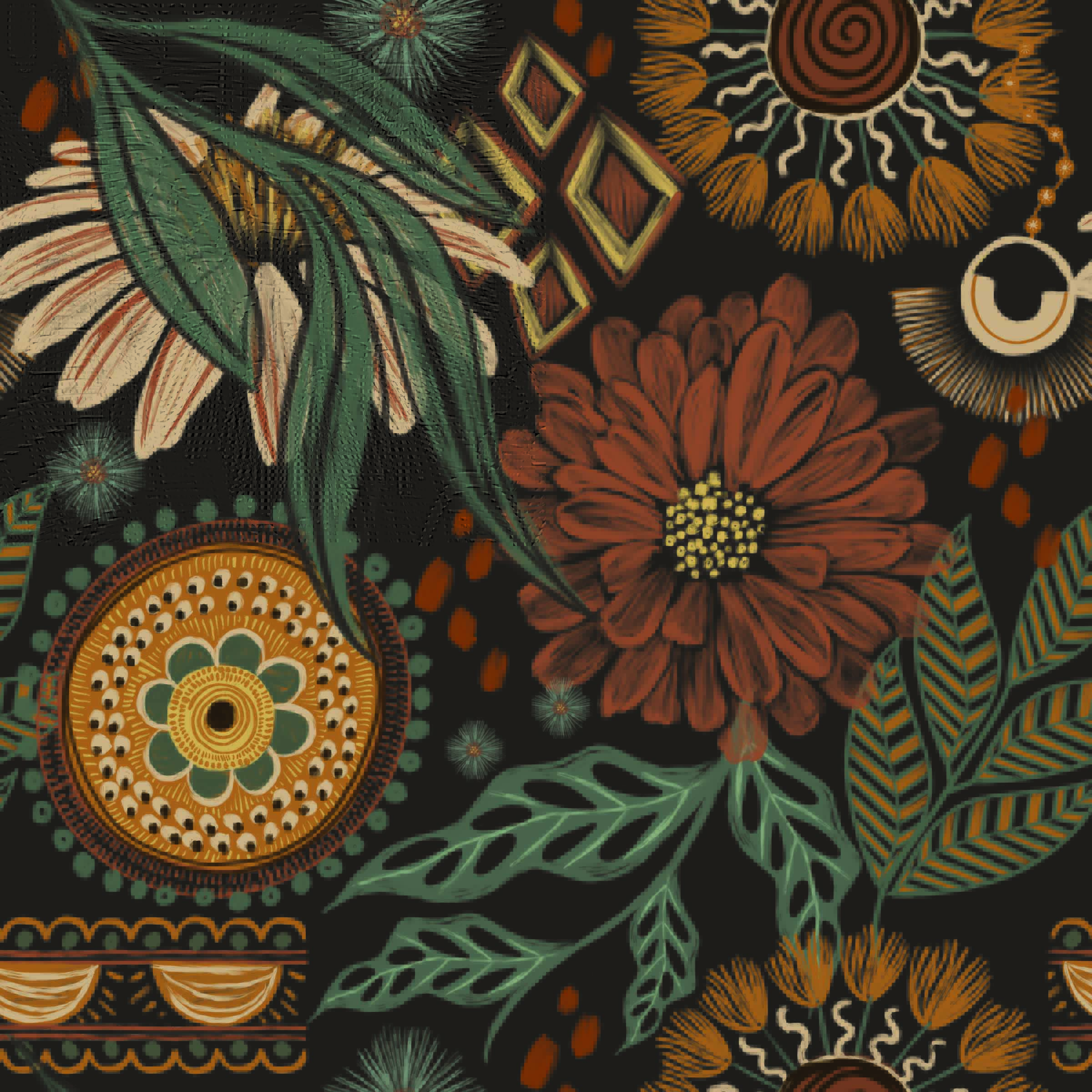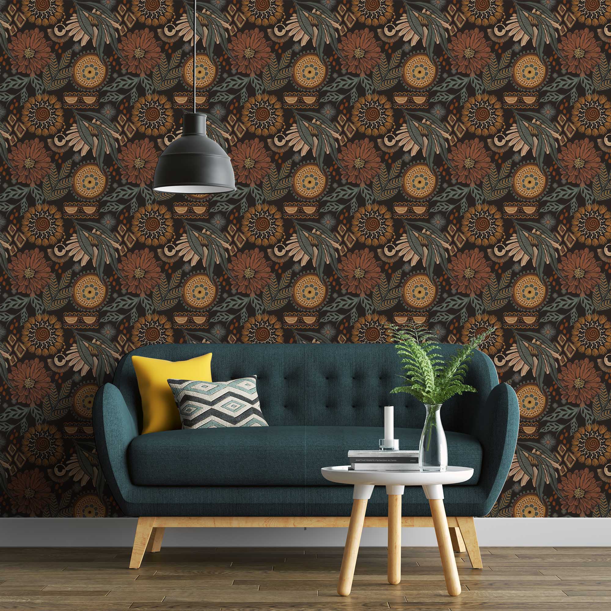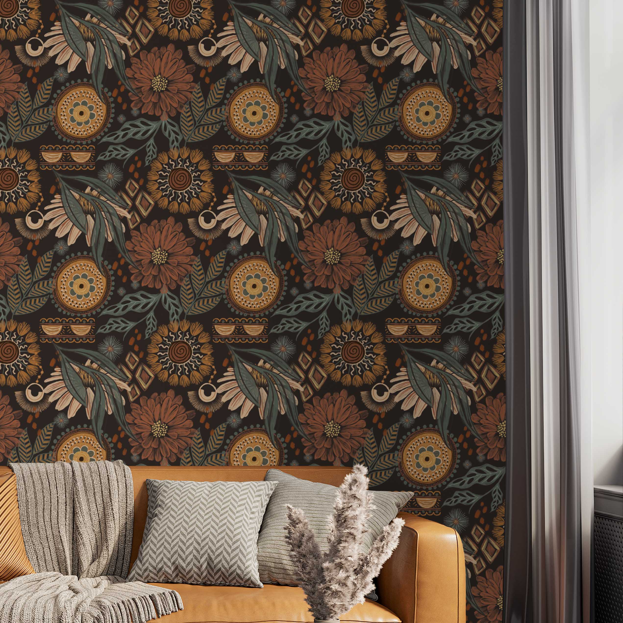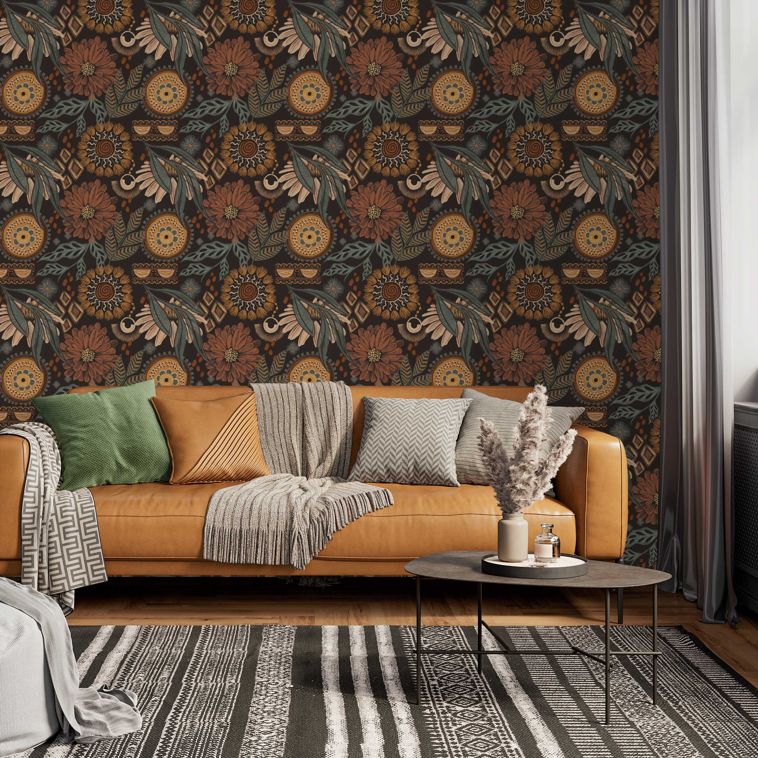 Expressive Style with Boho Bliss Wallpaper – This striking peel and stick wallpaper blends bohemian symbols with tribal-inspired details. Burnt orange, ochre, and olive motifs bloom over a rich black canvas, featuring bold sunbursts, florals, and geometric shapes. Ideal for eclectic lounges, creative nooks, or bedrooms needing warmth and vibrancy. Easy to install, remove, and reposition—our commercial-grade wallpaper is renter-friendly, washable, and waterproof, perfect for bold, commitment-free interiors.