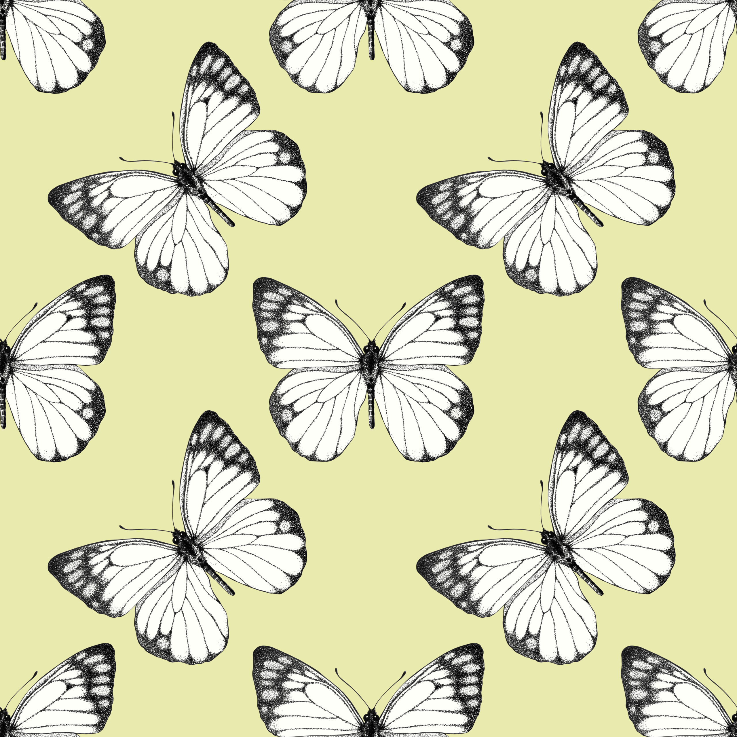 Transform your space into a bright, cheerful sanctuary with the Butterfly Breeze Yellow Wallpaper. This striking repeating pattern showcases beautifully illustrated butterflies, rendered in crisp black and white line art that pops perfectly against the warm, pastel yellow canvas.