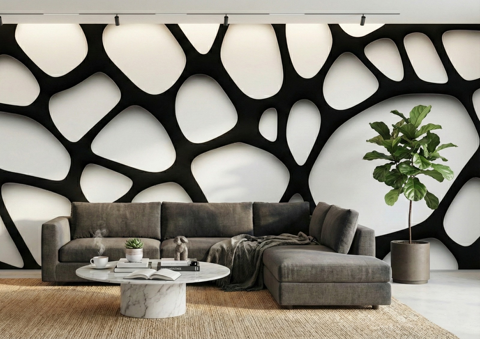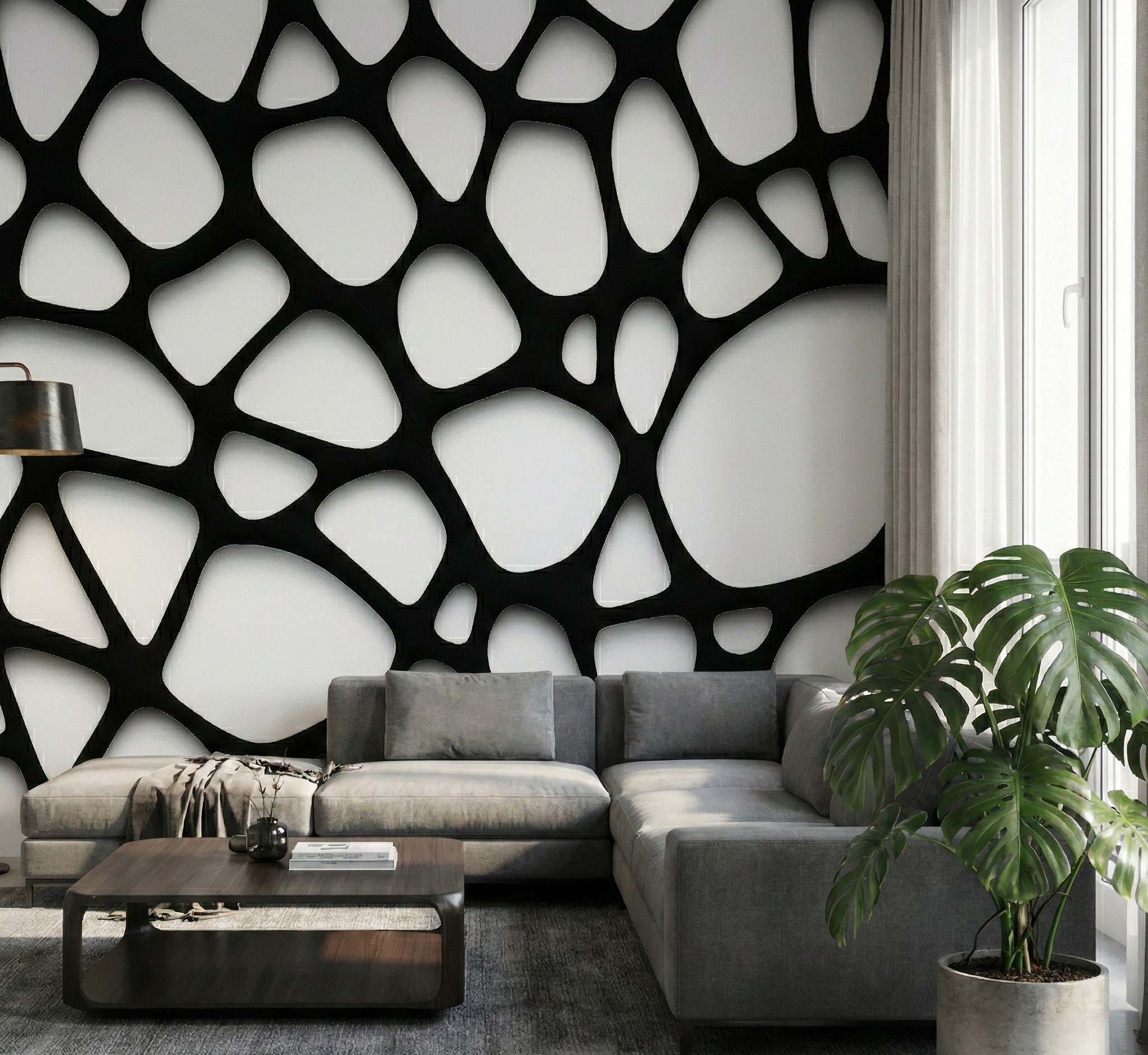 Introduce a touch of architectural intrigue and modern dynamism to your walls with the Cellular Lattice Mural. This captivating design presents an organic network of irregular black structures—reminiscent of biological cells, voronoi patterns, or a complex spiderweb—set against a crisp white background.