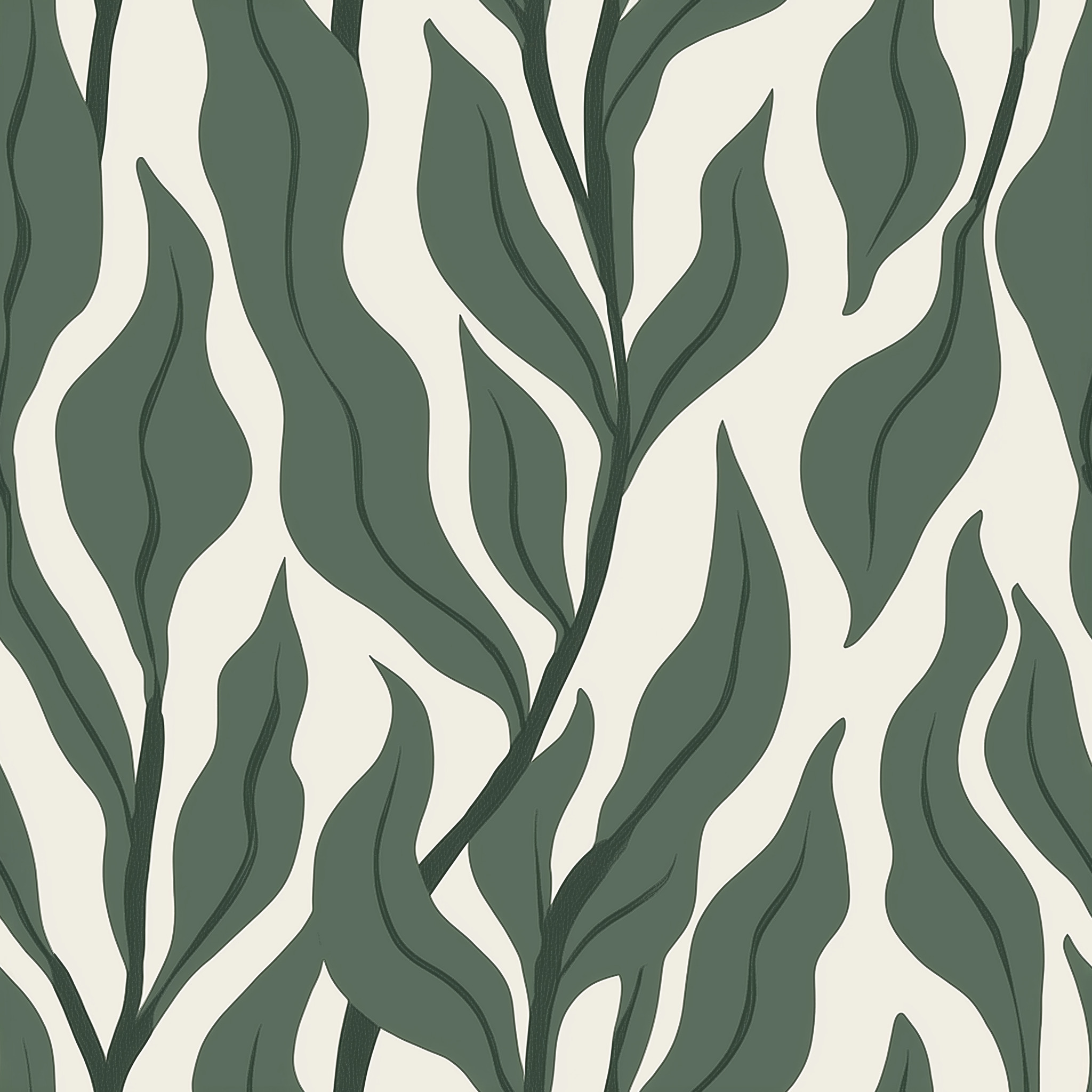 Immerse your room in the calming rhythm of nature with the Deep Sage Willow Wallpaper. This contemporary botanical print is defined by its sense of movement, featuring elongated, wavy foliage that appears to sway gently upwards. The leaves are rendered in a deep, matte sage-green that contrasts beautifully with the clean, off-white negative space.