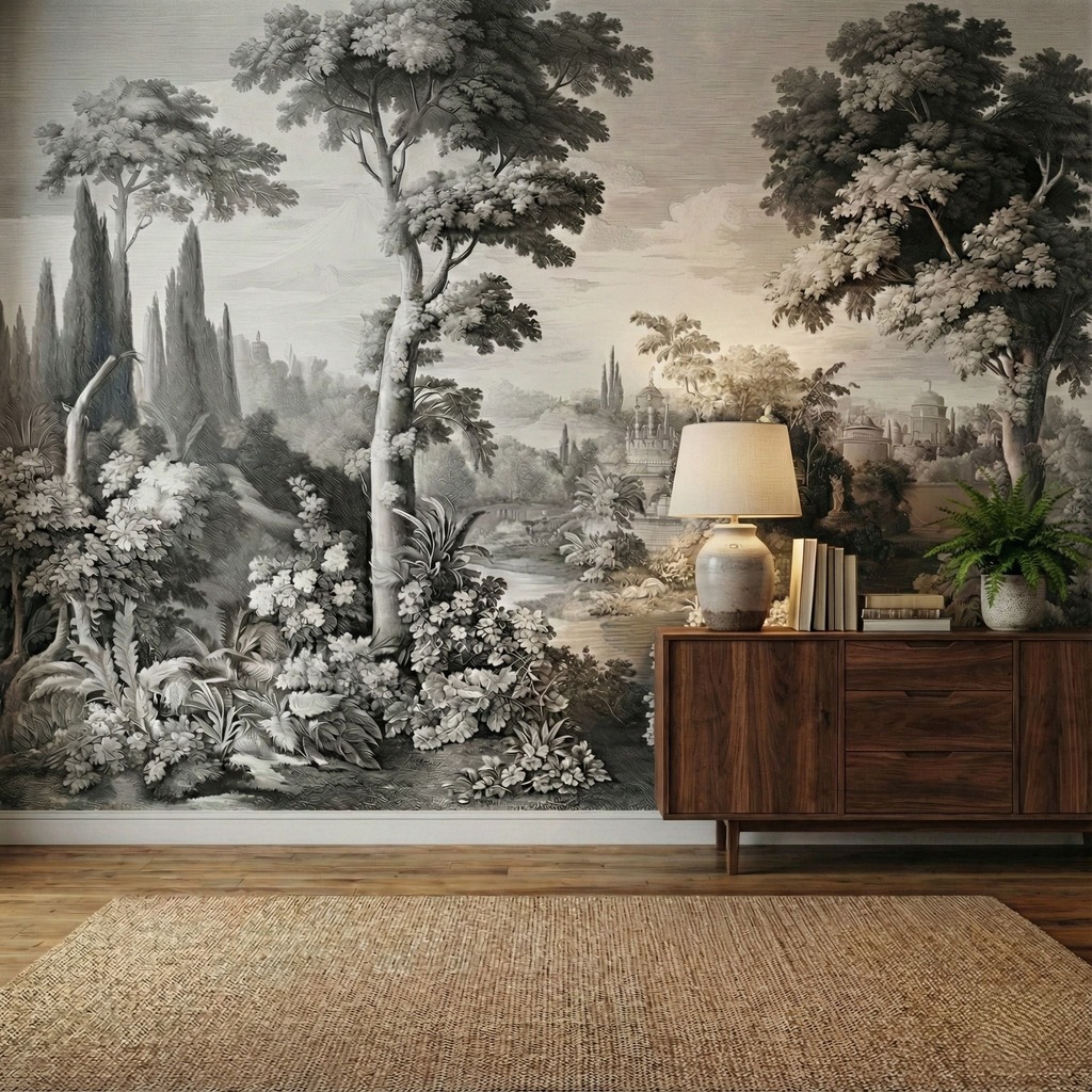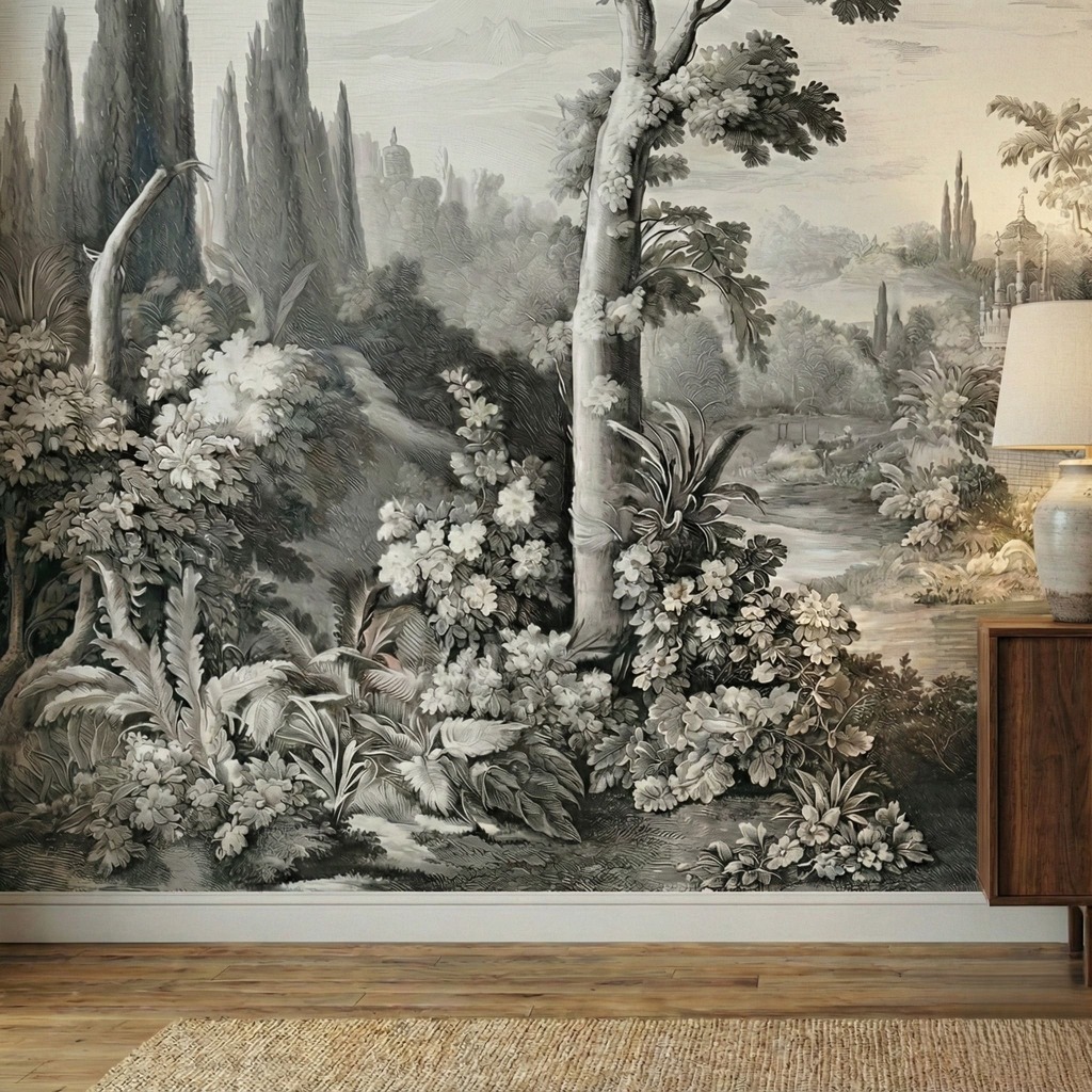 Perfect for creating a statement feature wall, this mural brings a sense of history and refined elegance to any room. It pairs exceptionally well with velvet furnishings, antique brass accents, and natural wood textures. Whether installed in a formal dining room, a quiet study, or behind a master bed, the Estate Garden Mural turns a blank wall into a window onto a forgotten, tranquil world.