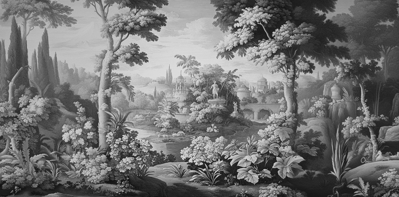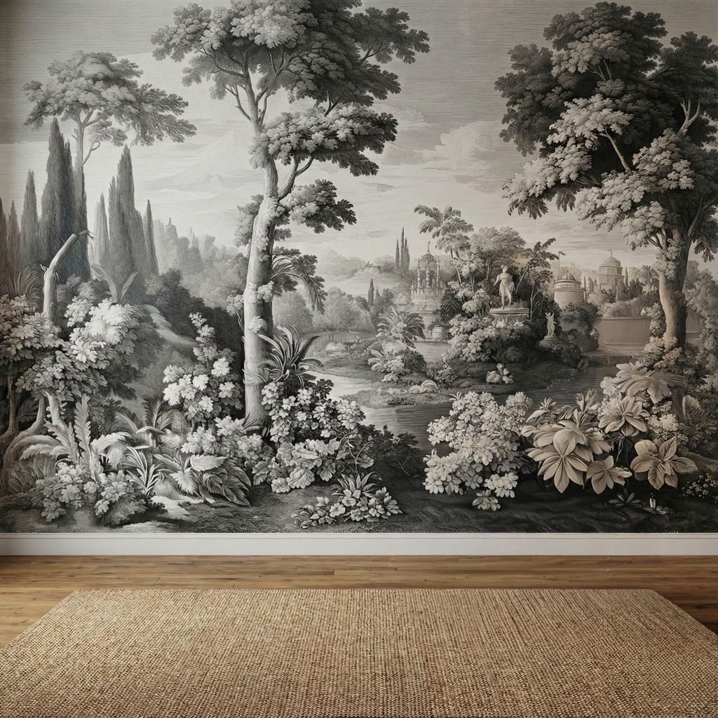 Imbue your home with the grandeur of an 18th-century masterpiece with the Estate Garden Mural. This breathtaking wall covering captures the essence of a romantic European estate, rendered in a stunning monochromatic palette that adds depth and drama without overwhelming your existing color scheme.
