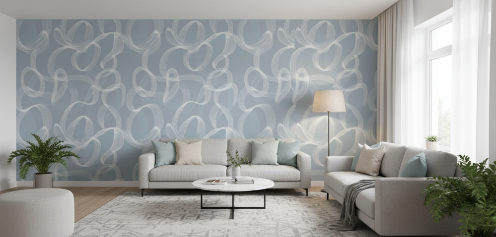 The sophisticated palette of muted steel blue and crisp white provides a calming atmosphere without sacrificing visual interest. Ideal for creating a focal point in a minimalist living room, a serene master suite, or a professional office environment, this mural brings a sophisticated, hand-drawn artistic quality to your interior design. Its expansive, flowing nature helps to visually open up a room, making it feel airy and boundless.