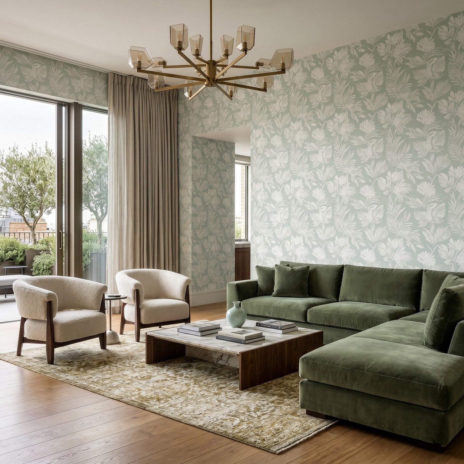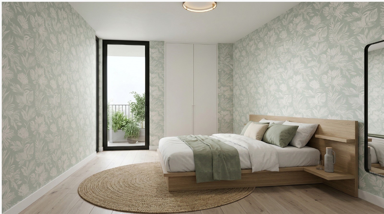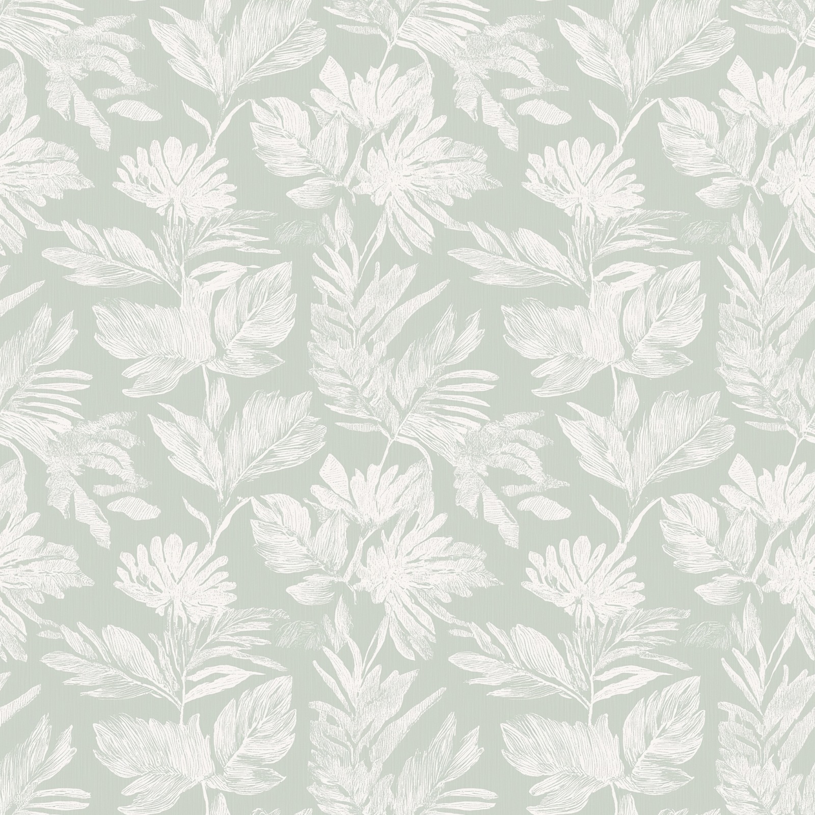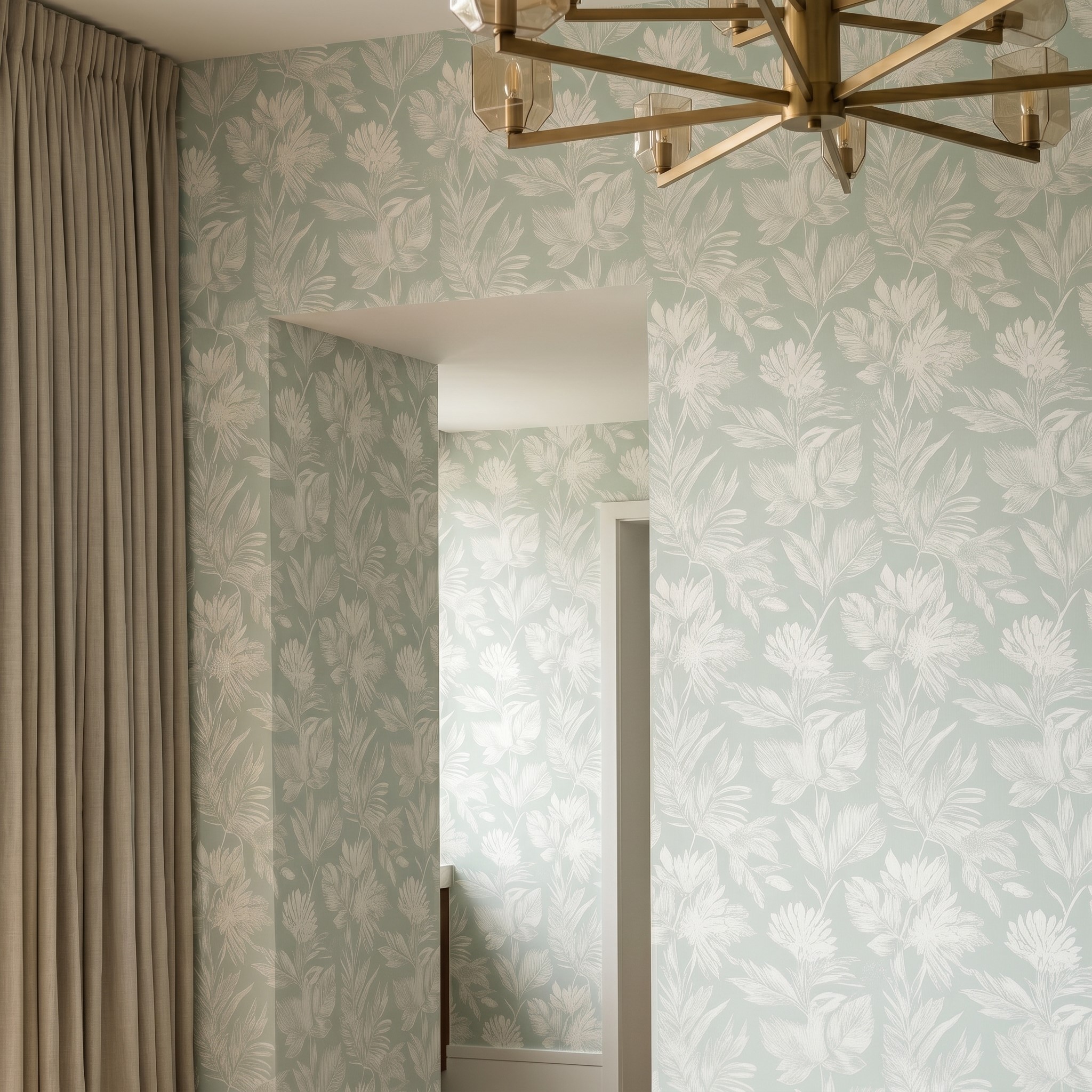 Infuse your home with the quiet beauty of nature with our Ethereal Fern Wallpaper. This design features a rhythmic, repeating pattern of botanical fronds and lush leaves, rendered in a light, etched sketch style. The crisp white illustrations contrast beautifully with the muted sage-mint background, which features a subtle vertical texture that adds depth and a premium “woven” feel to your walls.