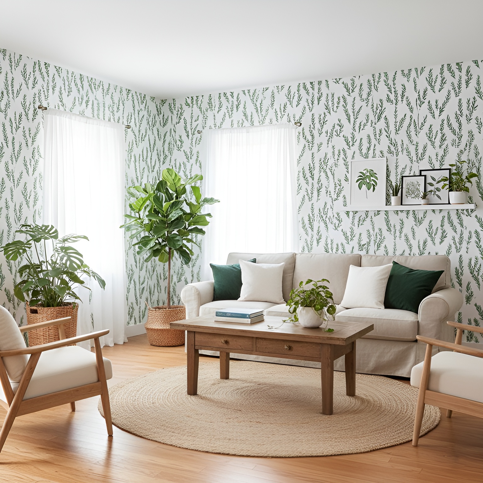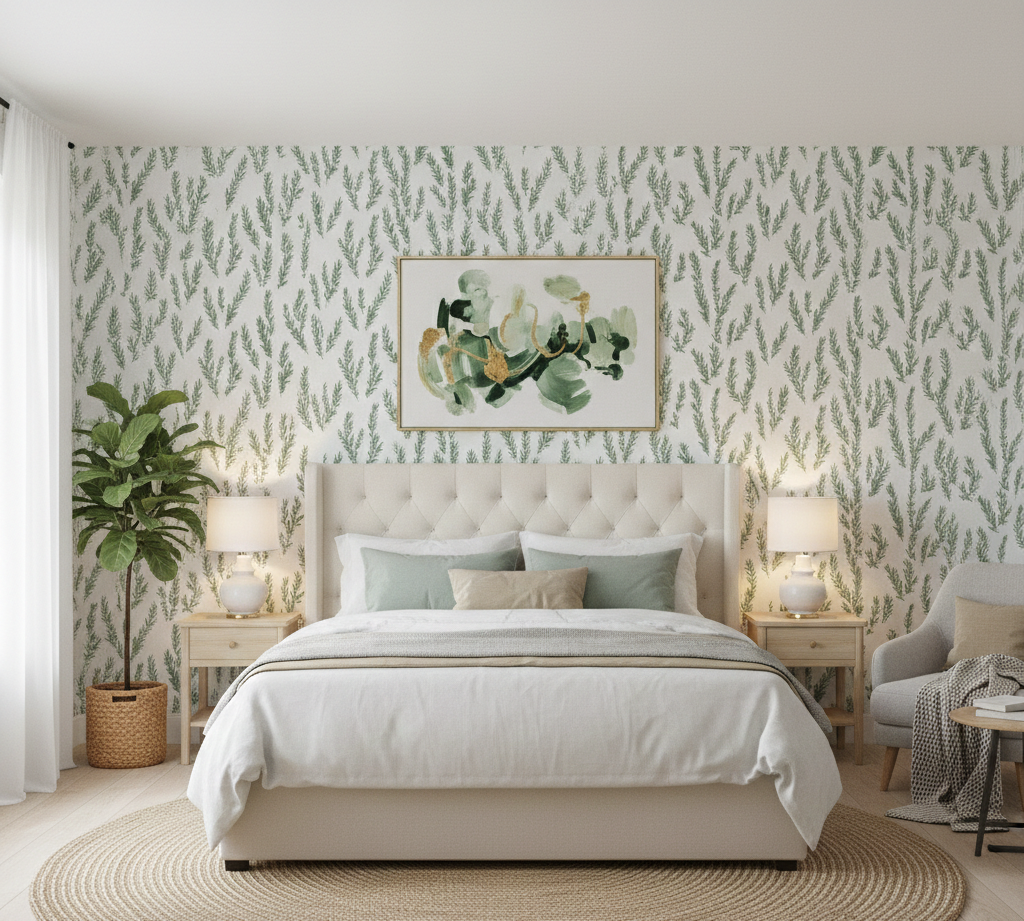 The loose, sketch-style quality of the artwork adds a soft, artisanal feel, preventing the pattern from feeling too rigid. It is an ideal choice for a farmhouse kitchen, a serene powder room, or a nature-inspired entryway, pairing effortlessly with wood accents, white ceramics, and natural linens.