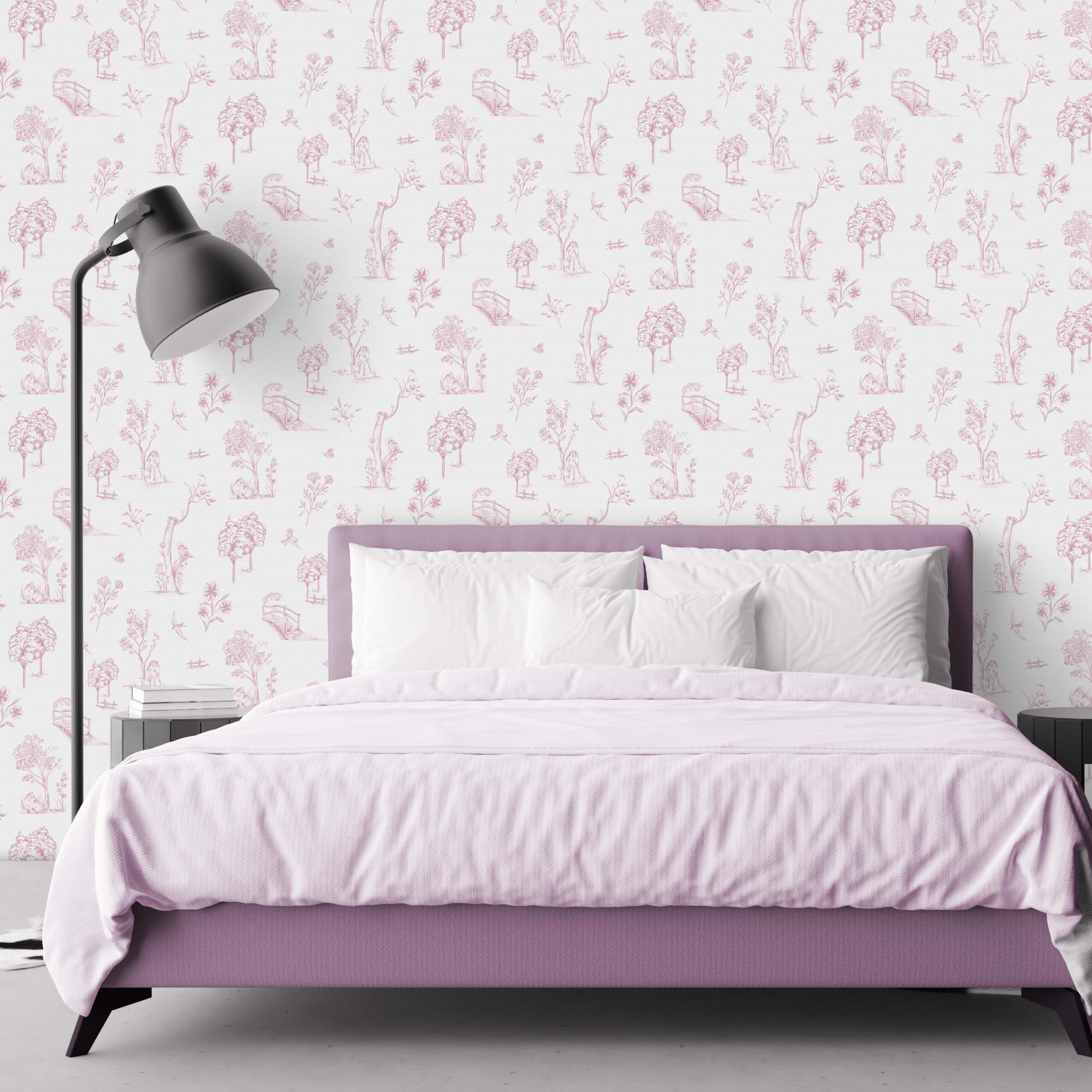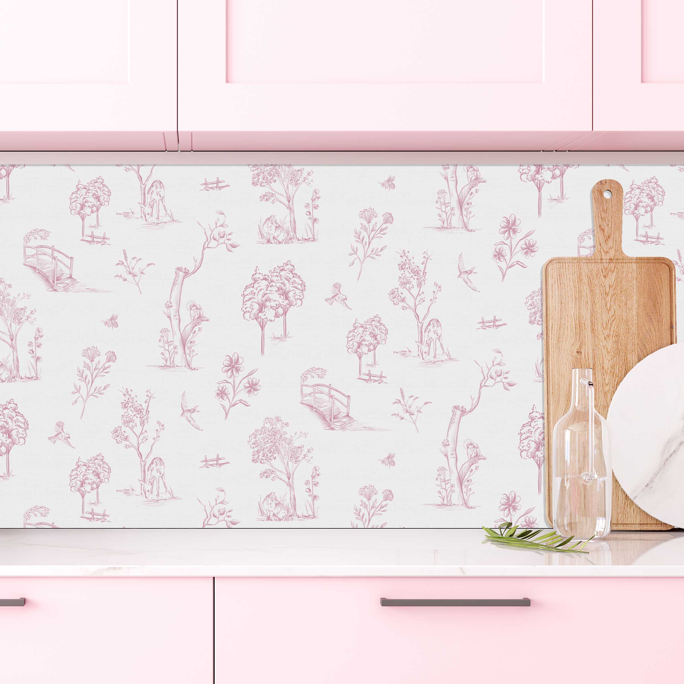 The Forest Toile in Pink Wallpaper is a modern twist on a vintage classic. This charming print features hand-drawn countryside scenes in a gentle pink hue against a soft ivory background. The artwork includes flora, fauna, tiny bridges, and quiet woodland moments — ideal for creating a peaceful, storybook atmosphere in bedrooms, nurseries, bathrooms, or chic kitchens. Whether used as a feature wall or full-room treatment, this design pairs beautifully with both minimalist and cottagecore interiors. Available in peel & stick, canvas-textured peel & stick, or traditional wallpaper materials — custom printed to your wall dimensions.