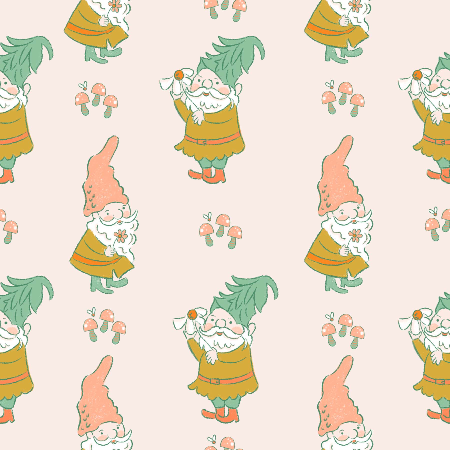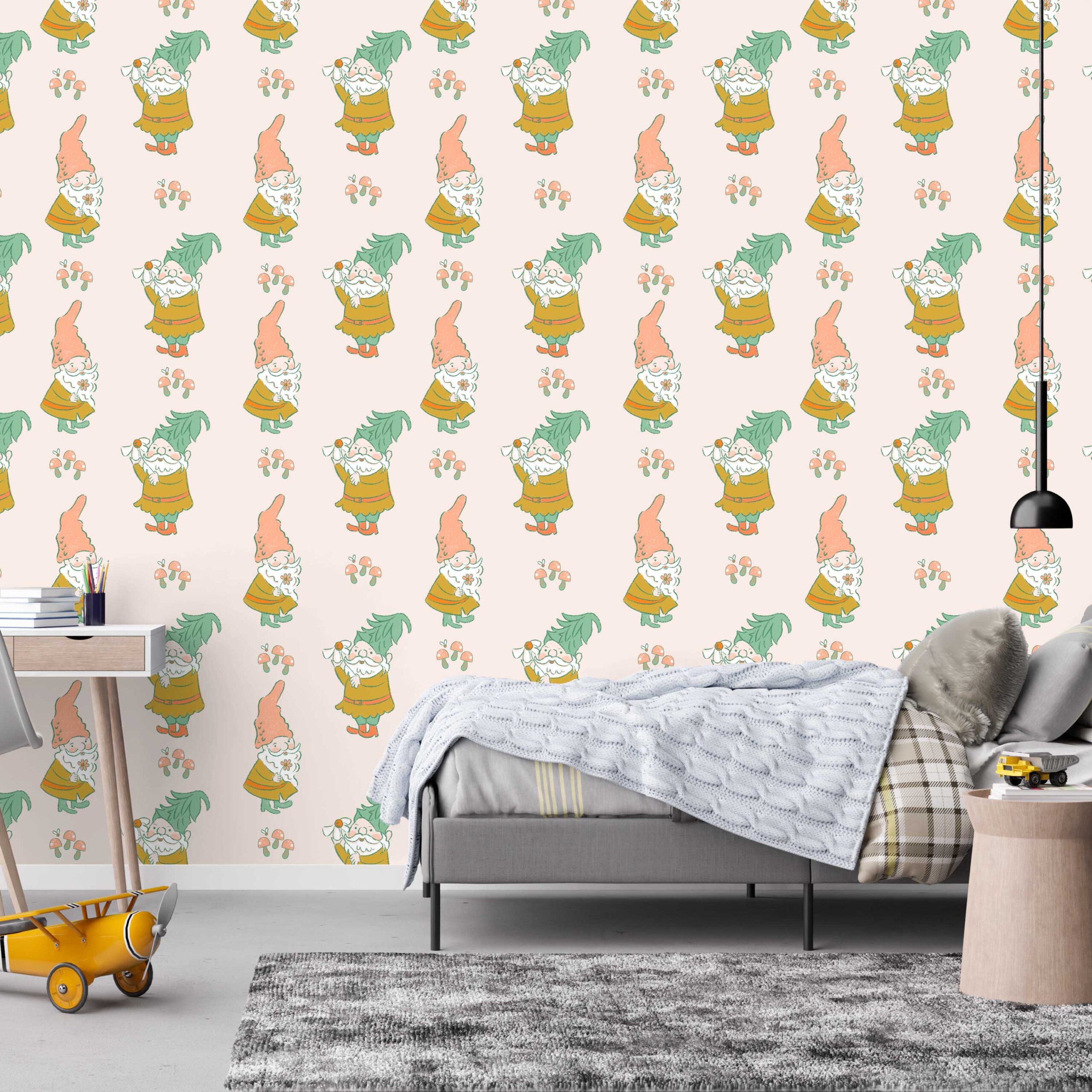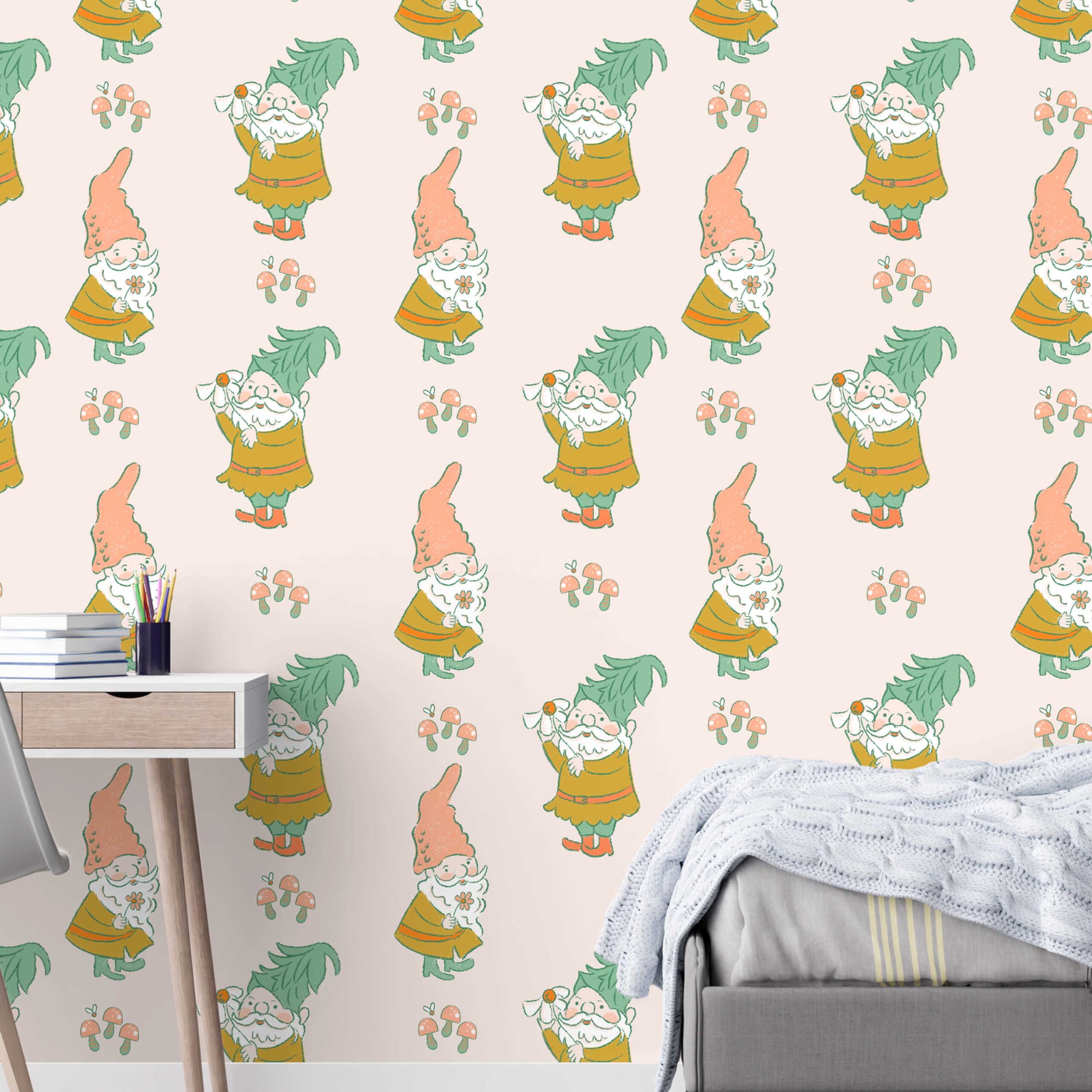 Bring Storybook Charm with Gnoming Around Wallpaper – Bursting with personality and fun, Gnoming Around features a joyful troupe of cartoon-style gnomes dressed in earthy tones, holding leaves and surrounded by mushrooms. The design’s soft pink background balances the vibrant characters with a gentle warmth, making it perfect for nurseries, playrooms, or whimsical nooks. Printed on high-quality peel and stick wallpaper that’s washable and renter-friendly, it’s designed to transform kids’ rooms into magical, imaginative spaces—without the mess or commitment.