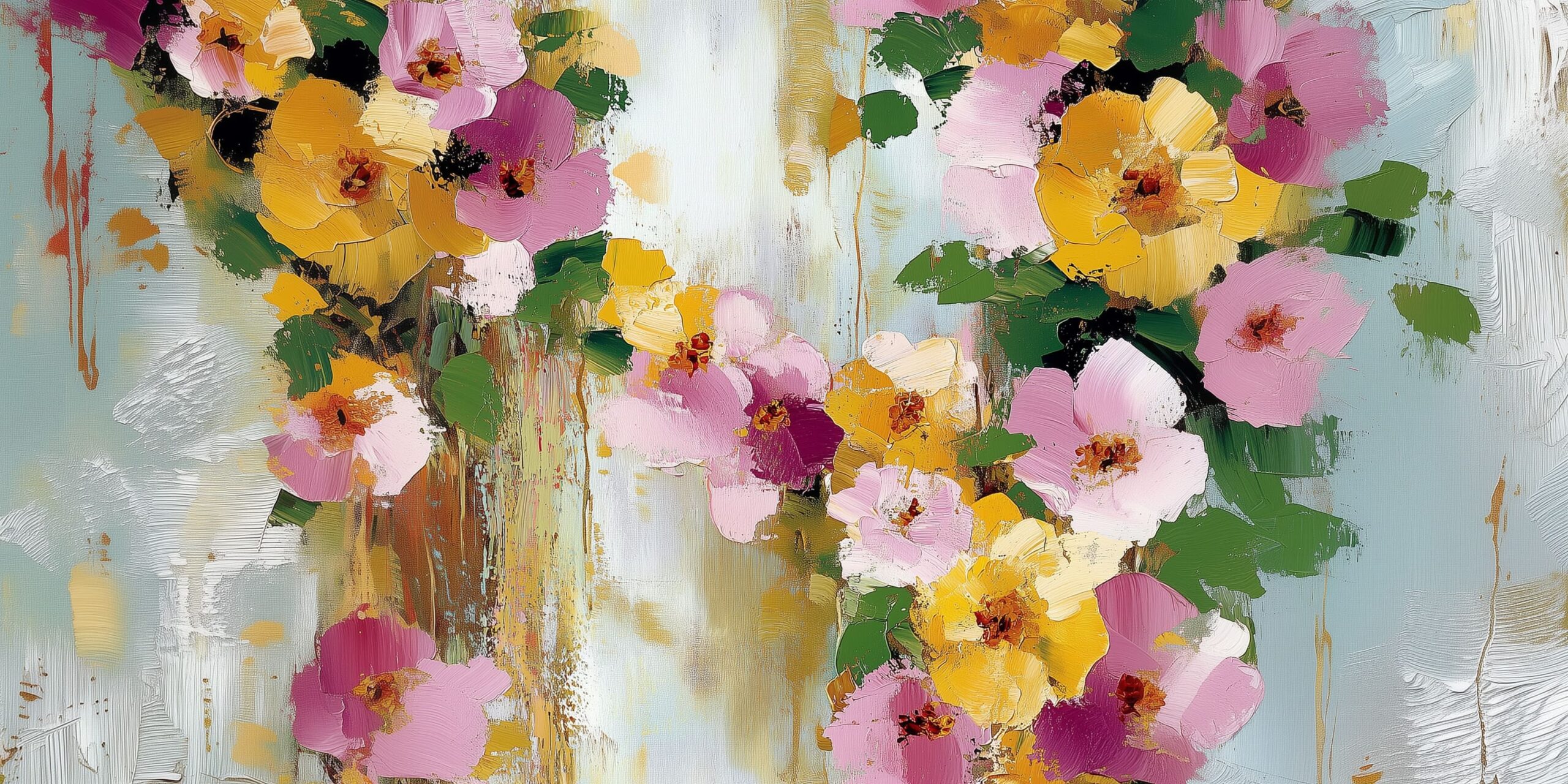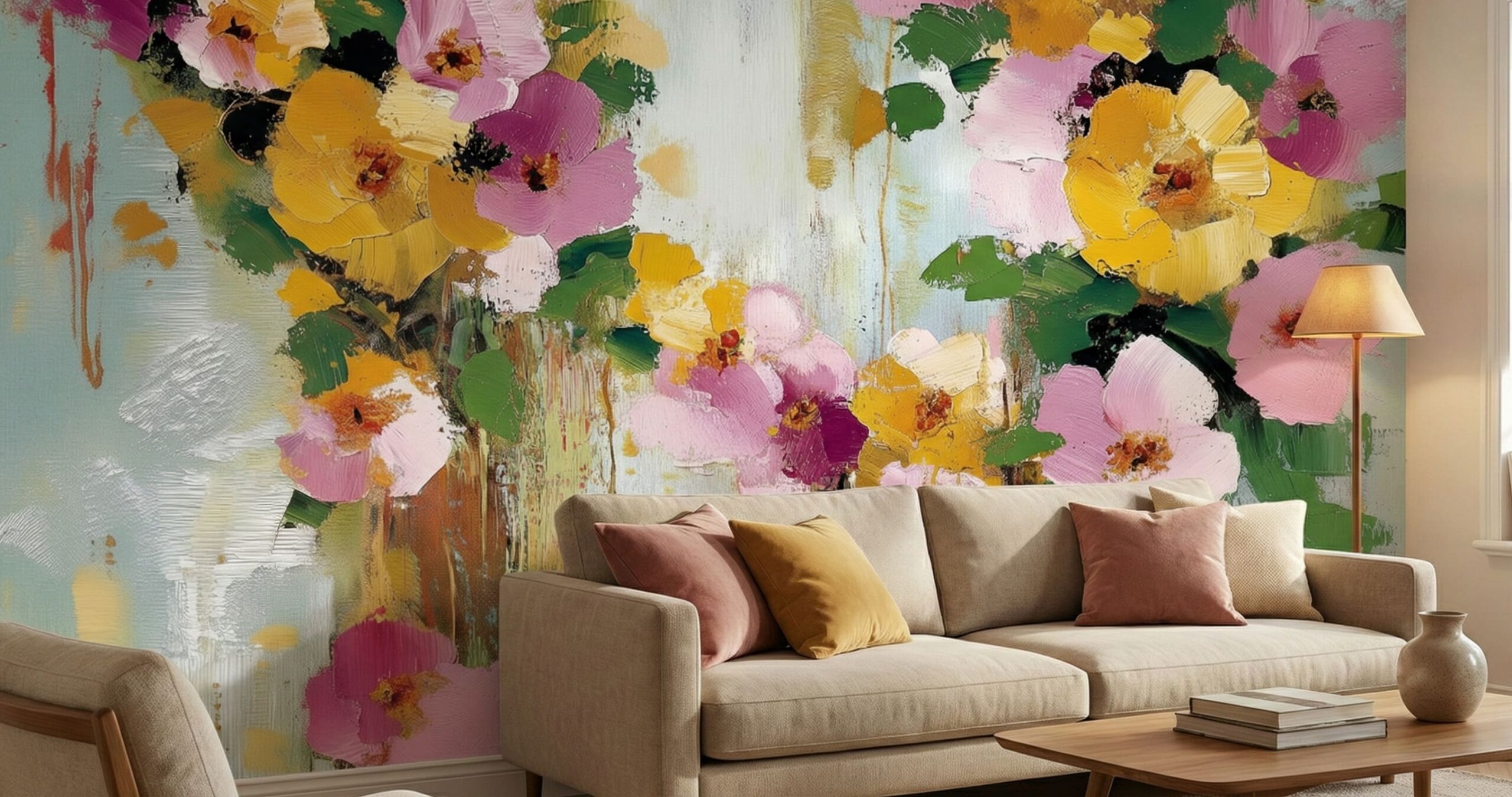 Bring the timeless beauty of fine art into your home with the Golden Blush Floral Mural. This breathtaking design captures the essence of an authentic oil painting, utilizing a rich impasto effect where visible, thick brushstrokes create incredible depth and tactile dimension on your wall. Clusters of vibrant mustard yellows, goldenrods, soft blush pinks, and deep rose blooms, accented by painterly green leaves, appear to cascade from the top, framed by an abstract, streaked background of soft sky blues and creamy whites. This impressionistic floral mural creates a romantic and sophisticated focal point, ideal for elevating a master bedroom, living room, or dining area with artisanal charm.