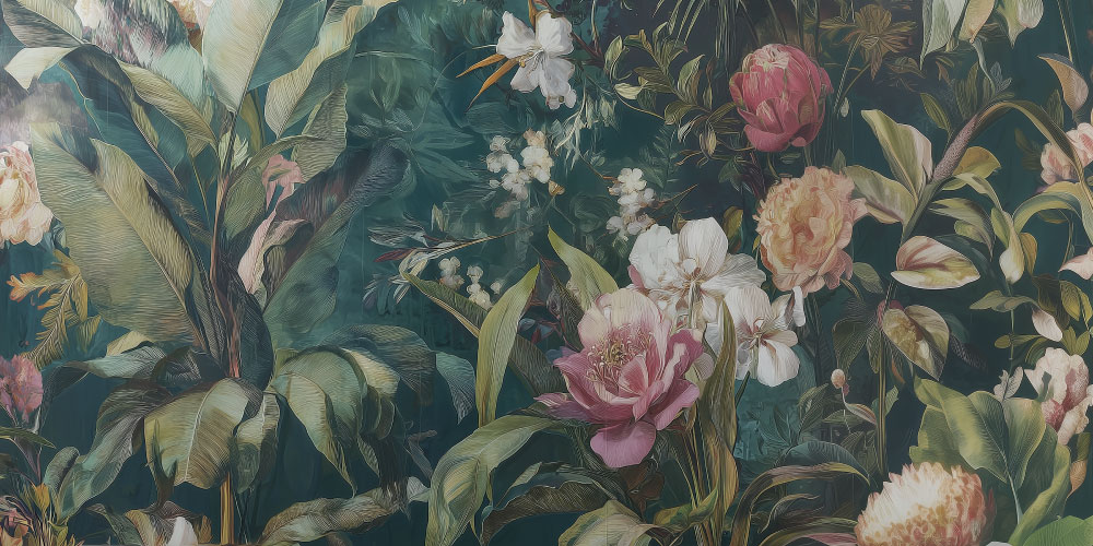 The Green Eden Mural captures the richness of the tropics with hand-drawn banana leaves, orchids, peonies, and exotic blooms. Set against a deep emerald backdrop, it creates a lush, atmospheric escape for Canadian interiors. Ideal for feature walls in living rooms, studios, or dining areas, it adds bold botanical beauty and a touch of wanderlust to your home.