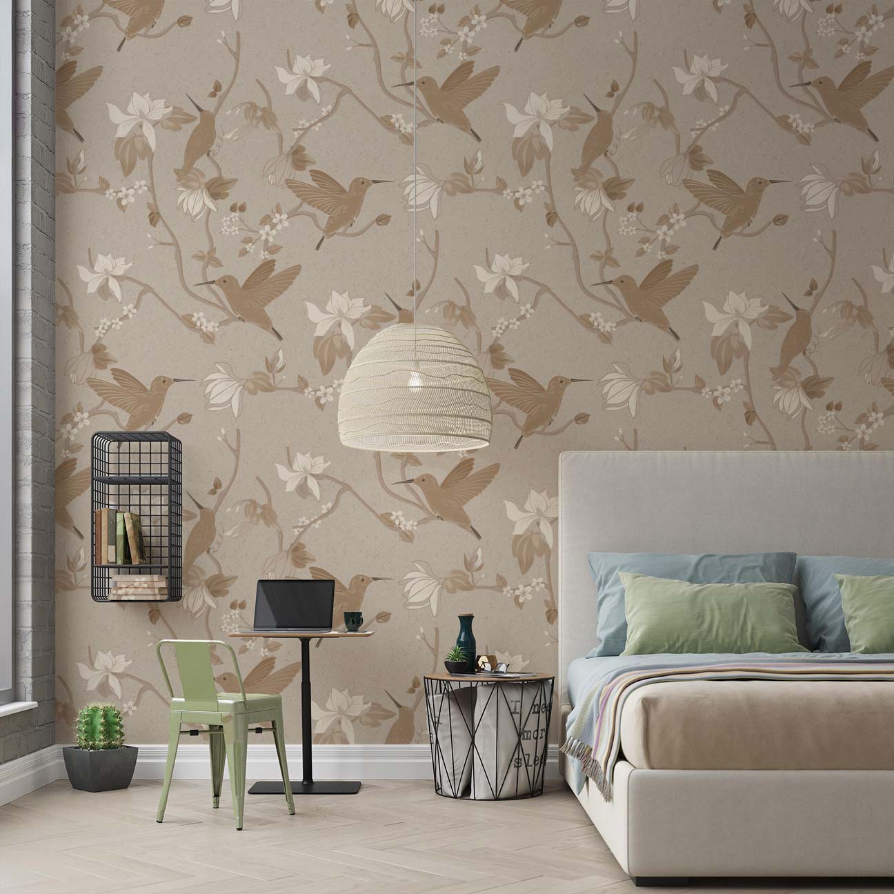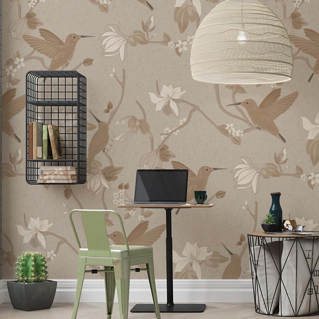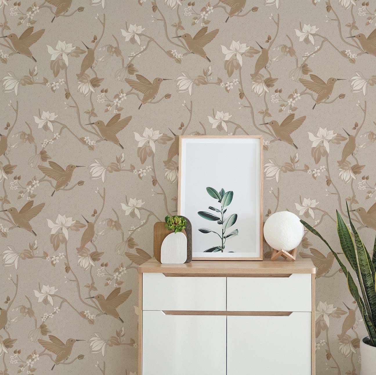 Bring refined elegance into your space with this beautifully detailed chinoiserie wallpaper. Featuring graceful hummingbirds perched among soft blooming branches, this design is rendered in warm golden mist tones that blend taupe, beige, and subtle cream hues for a soothing, elevated look. Perfect for bedrooms, living spaces, or feature walls, this wallpaper creates a serene yet sophisticated environment with its balanced composition and delicate detailing. Designed to complement both modern and classic interiors, it pairs effortlessly with natural textures, soft furnishings, and neutral palettes. Printed using eco-friendly inks and fully customizable to your wall dimensions, this wallpaper offers a luxurious, tailored finish for any space.