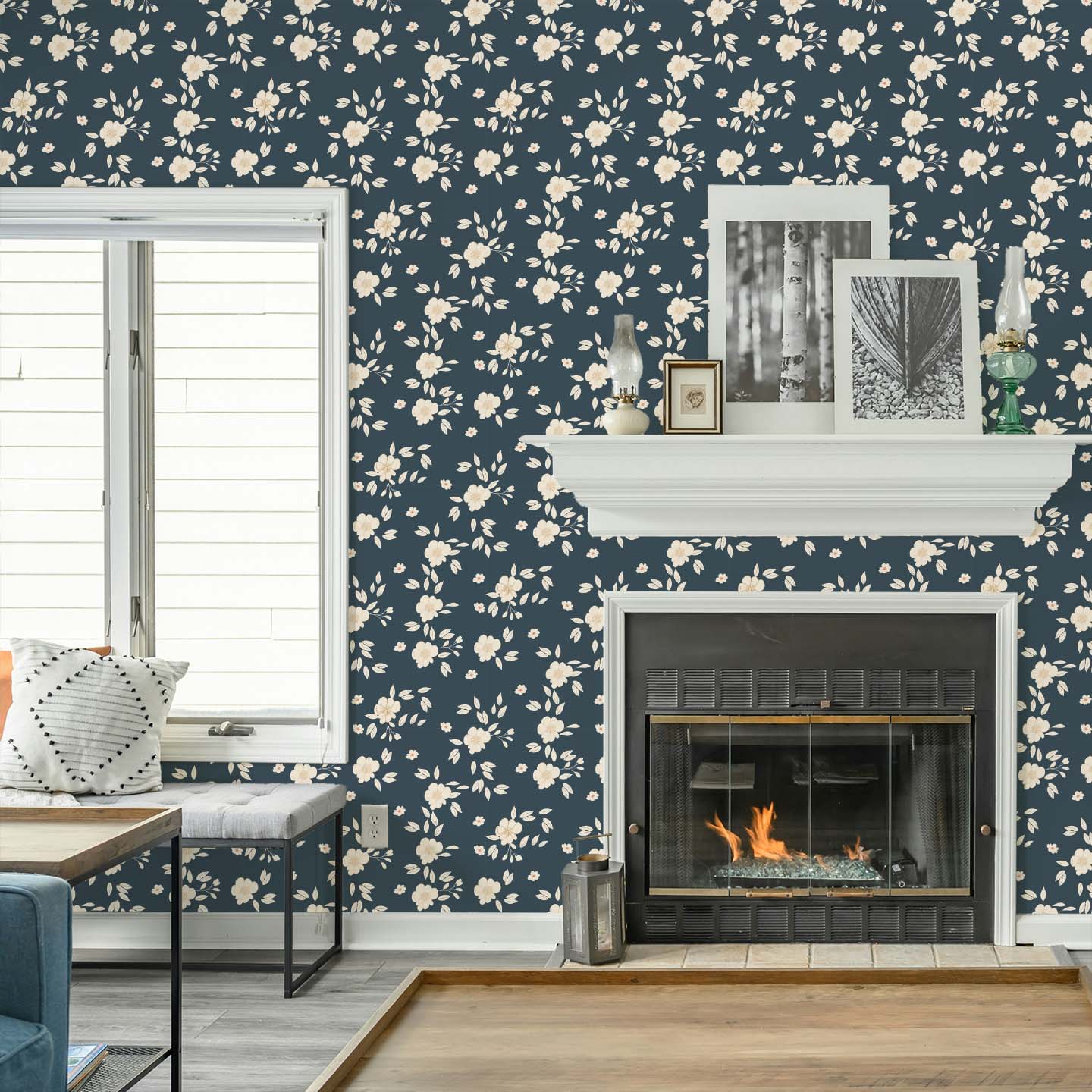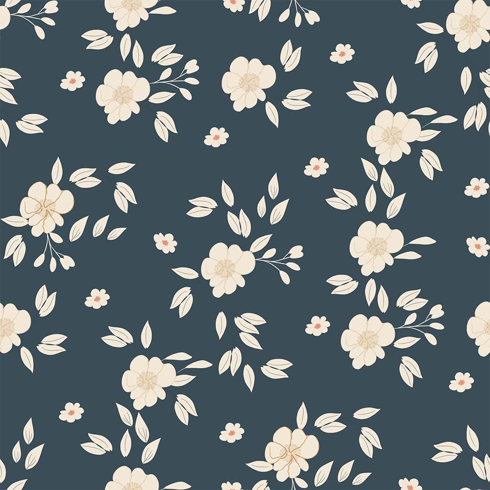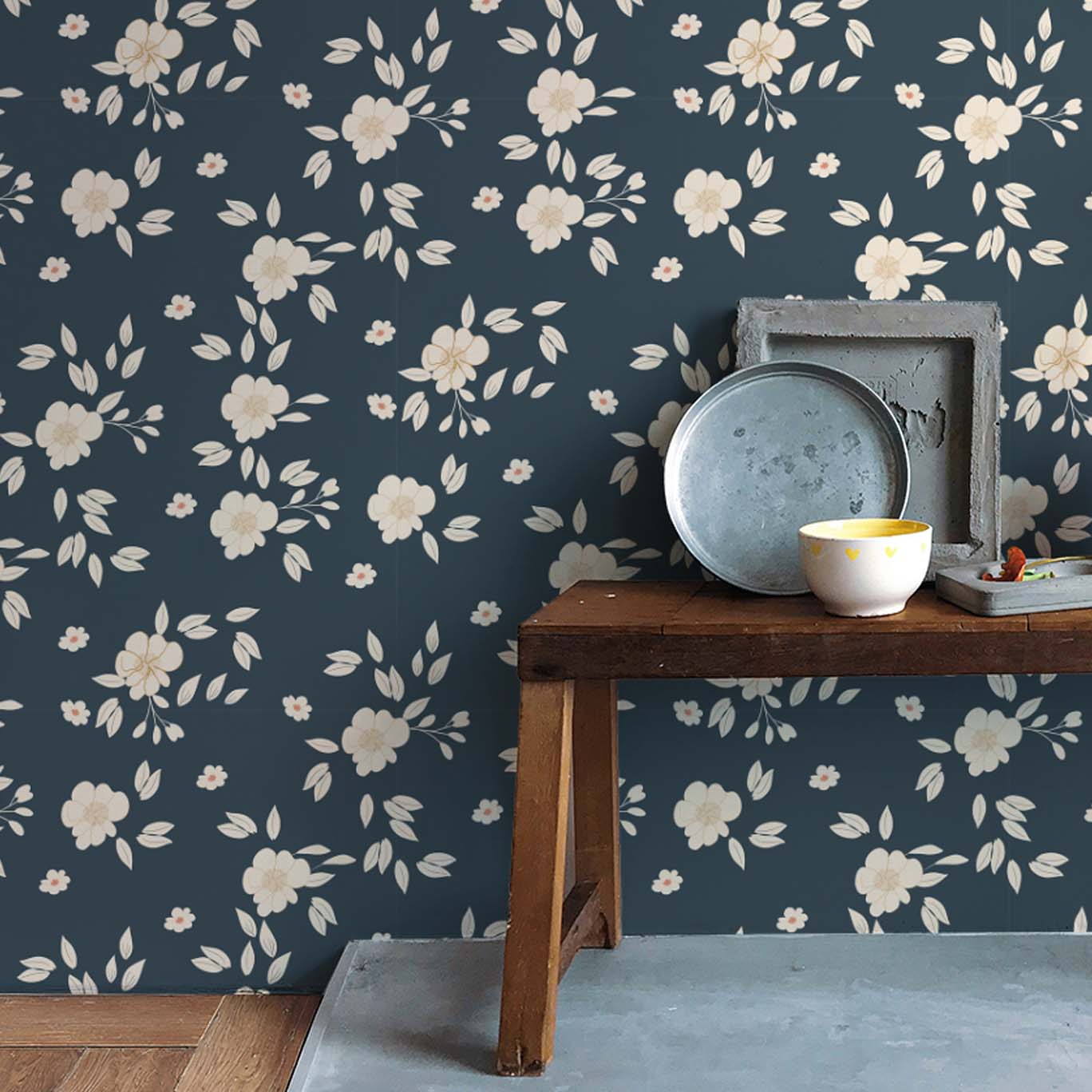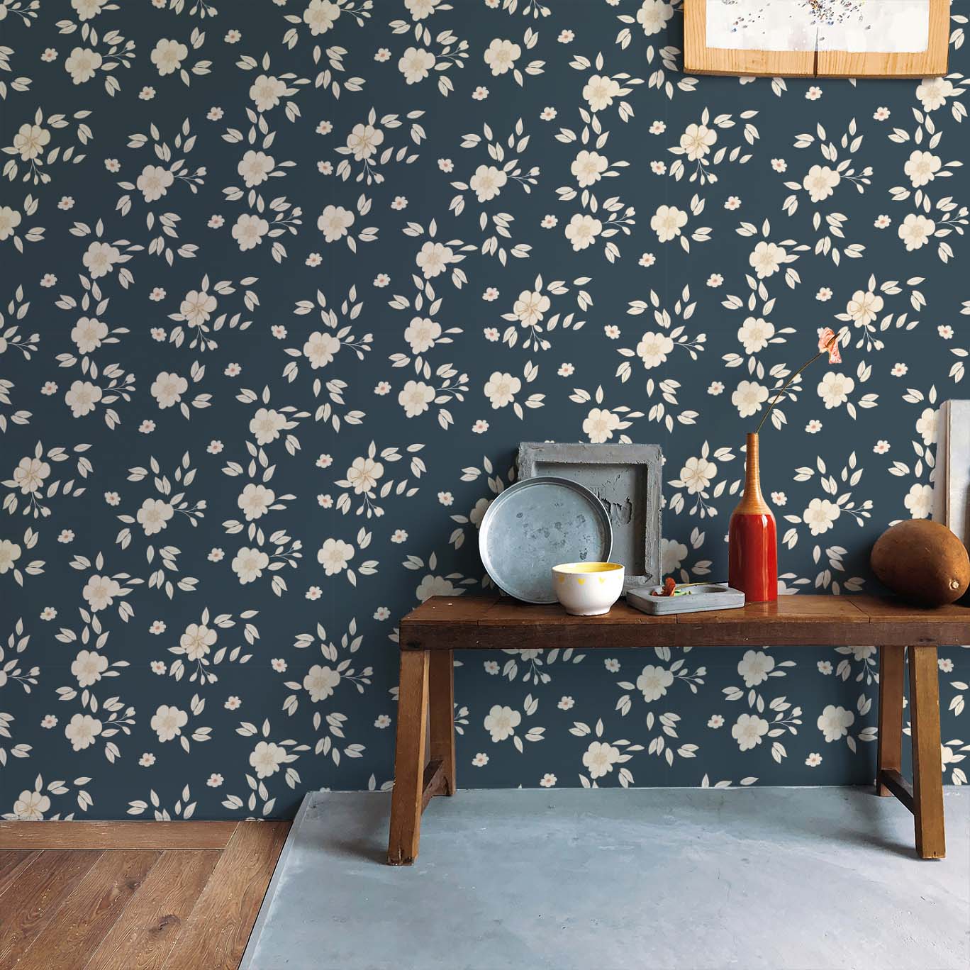 Hazel Wallpaper in Midnight Bloom features a beautifully balanced floral pattern of soft cream blossoms and delicate leaves set against a deep navy backdrop. This design brings depth and sophistication to any space while maintaining a soft, approachable aesthetic. Ideal for living rooms, dining spaces, or statement feature walls, it pairs effortlessly with warm woods, brass accents, and neutral furnishings. The contrast between the dark background and light florals adds visual impact without overwhelming the room, making it perfect for both modern and classic interiors seeking a refined, moody atmosphere.