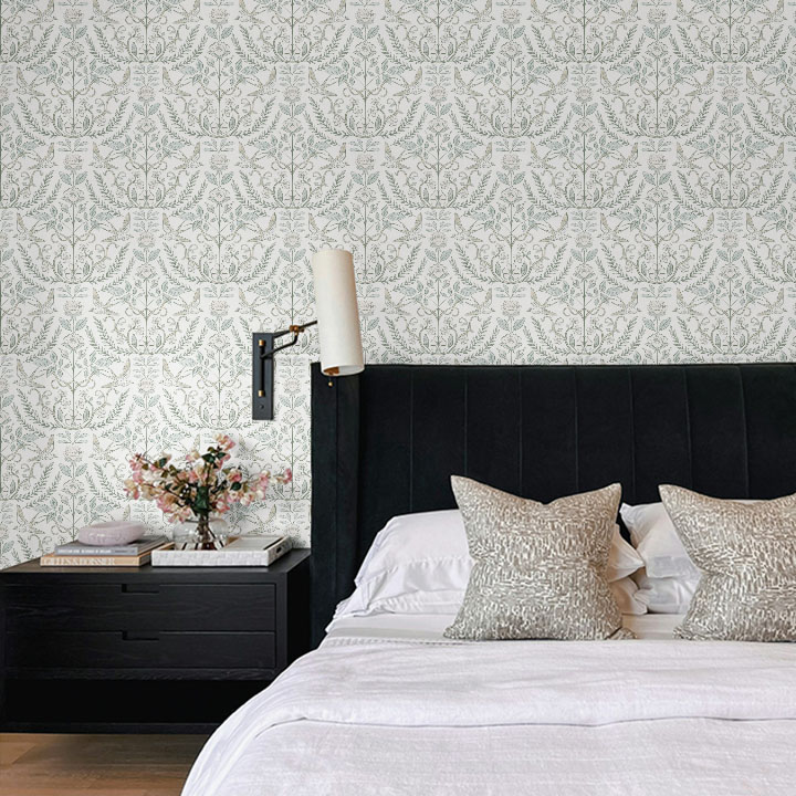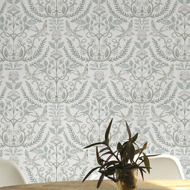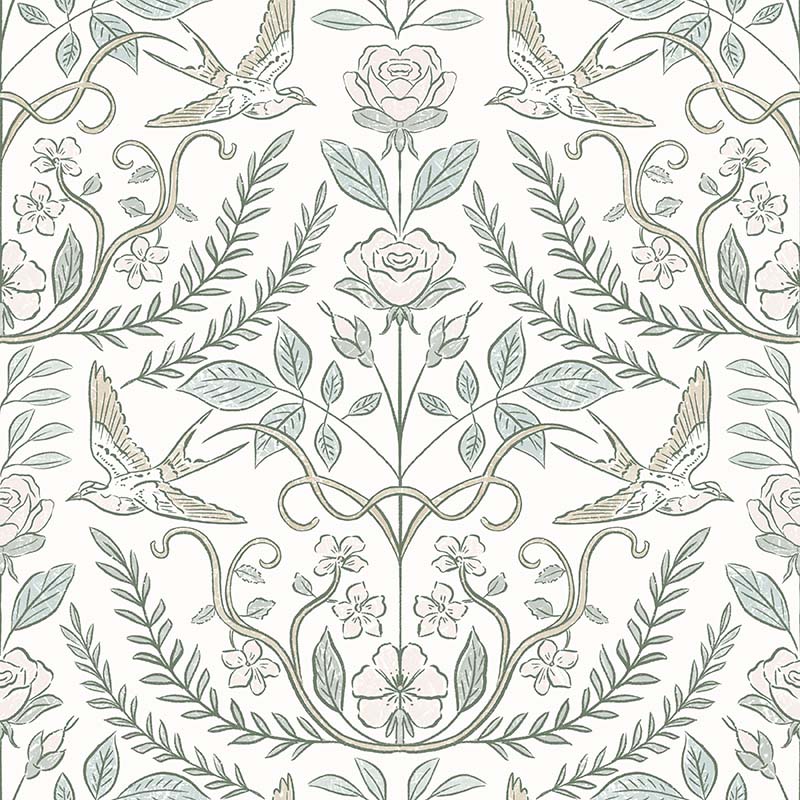 Inspired by traditional botanical illustrations and historic textile design, Heirloom Garden Wallpaper showcases an intricately balanced pattern of birds, roses, and leafy garlands. The symmetrical layout and delicate linework evoke a sense of heritage craftsmanship while remaining refined and versatile for modern spaces.