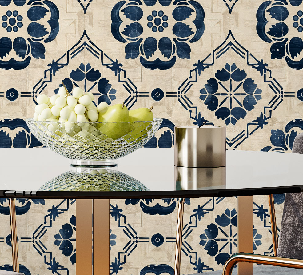 This wallpaper features a classic Iberian tile-inspired pattern with navy blue floral and geometric motifs set against a warm beige textured background. The design evokes a hand-painted, artisanal feel — perfect for adding Mediterranean charm and timeless elegance to kitchens, bathrooms, or accent walls.