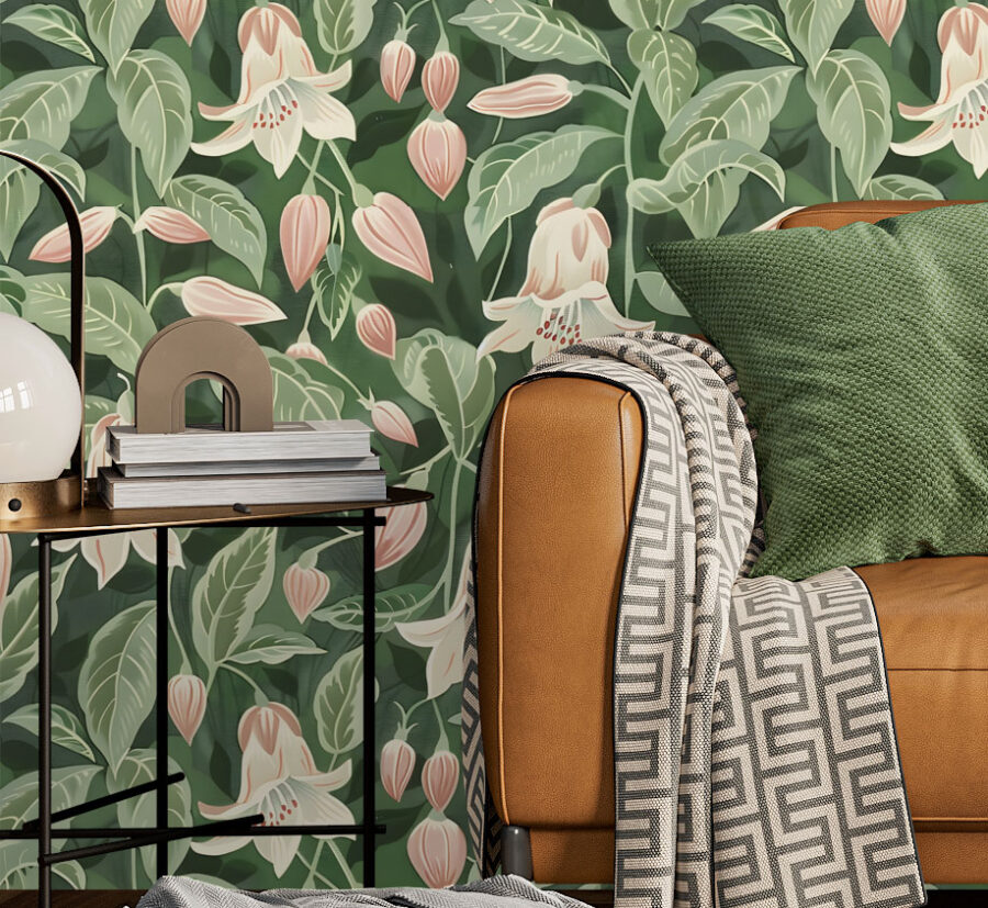 *Moonflower Grand Vert Wallpaper* brings nature indoors with lush greens and organic textures. This forest-inspired peel & stick mural is made in Canada, waterproof, removable, and ideal for rentals. Printed on a canvas-textured finish, it’s perfect for bathrooms, bedrooms, or meditation spaces – high-end design, low price.
