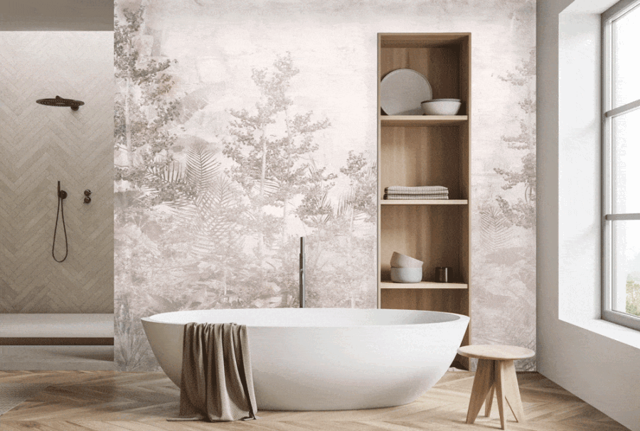 *Mural Drake Forest* brings nature indoors with lush greens and organic textures. This forest-inspired peel & stick mural is made in Canada, waterproof, removable, and ideal for rentals. Printed on a canvas-textured finish, it’s perfect for bathrooms, bedrooms, or meditation spaces – high-end design, low price.