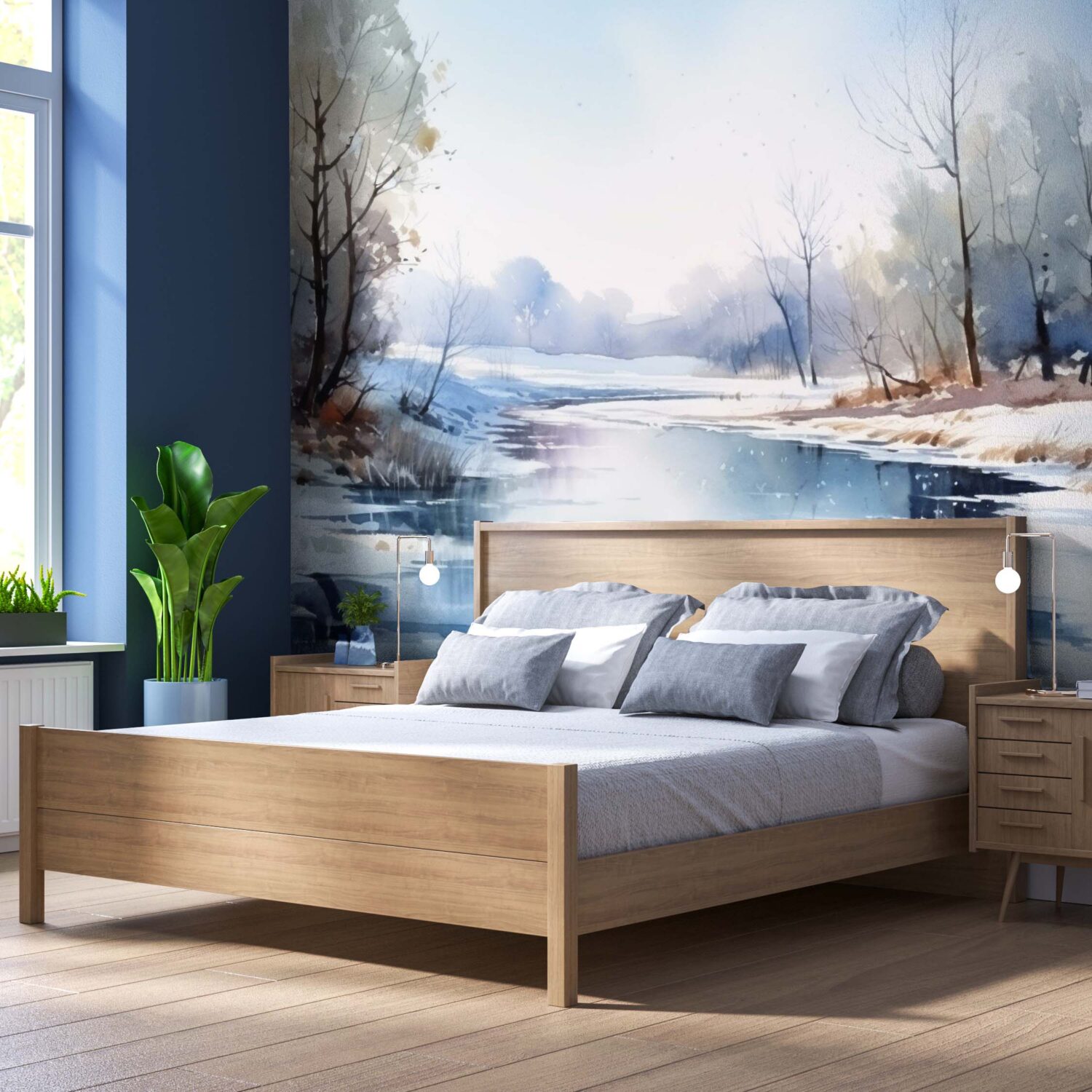 *Mural Winter Crystal Reflections* brings nature indoors with lush greens and organic textures. This forest-inspired peel & stick mural is made in Canada, waterproof, removable, and ideal for rentals. Printed on a canvas-textured finish, it’s perfect for bathrooms, bedrooms, or meditation spaces – high-end design, low price.