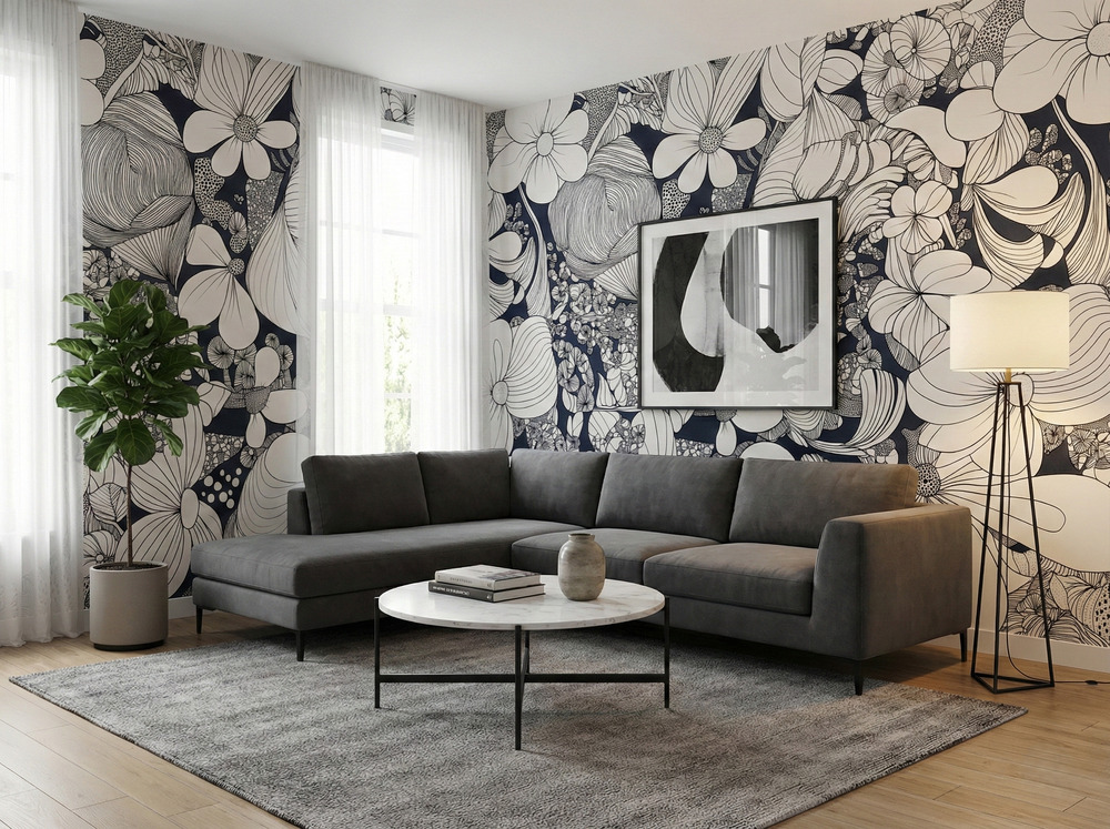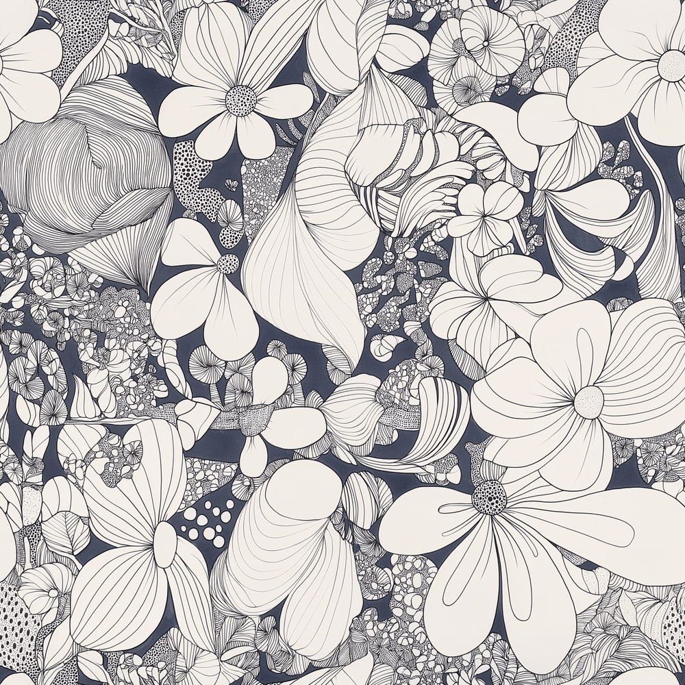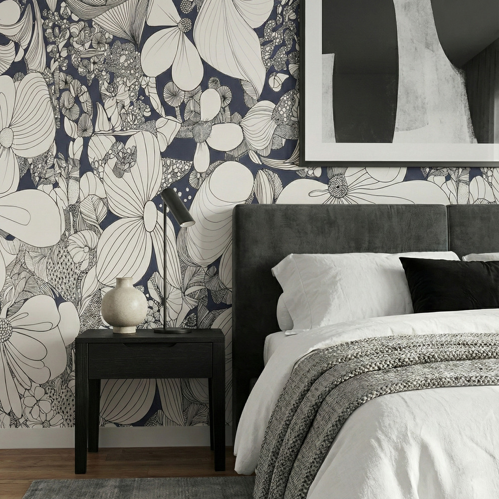 Transform your interior into a modern masterpiece with the Noir Botanical Wallpaper. This design moves away from traditional florals, embracing a graphic, avant-garde aesthetic that mimics the intricate detail of a hand-drawn sketchbook. The pattern features oversized blooms, sweeping leaves, and abstract organic shapes rendered in crisp black lines against a clean white background.