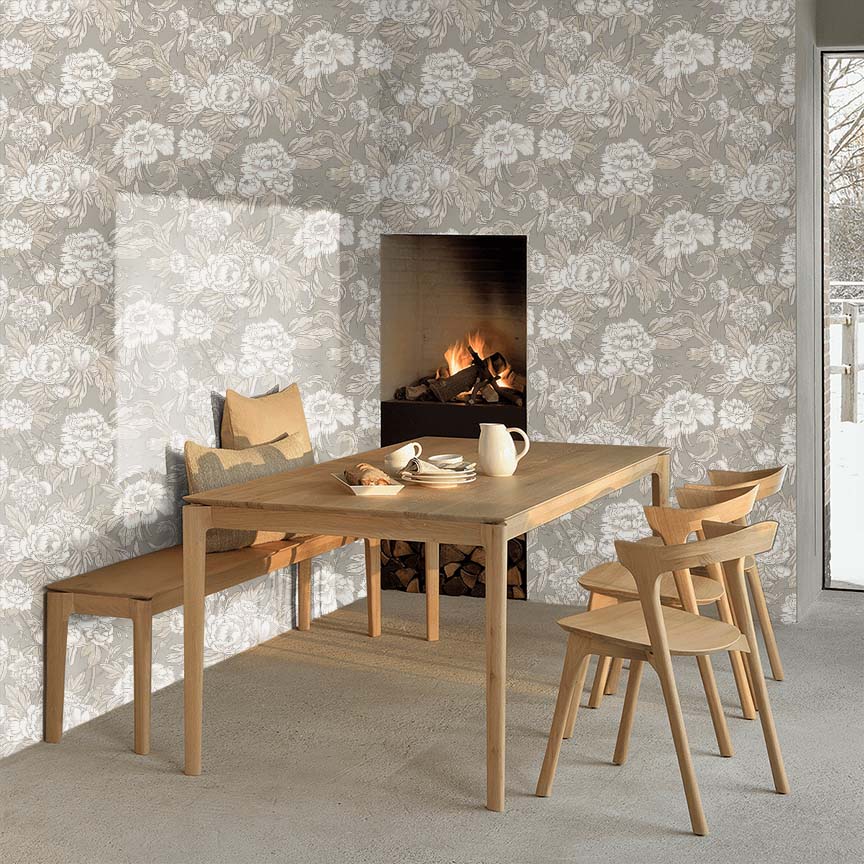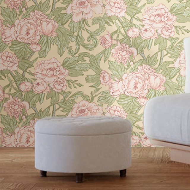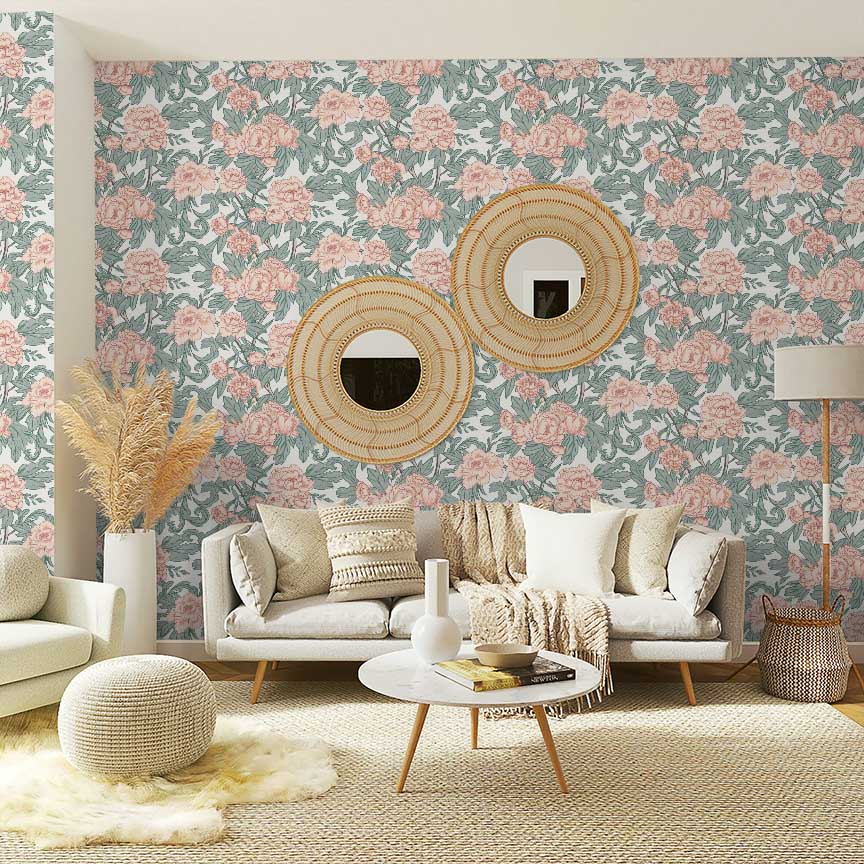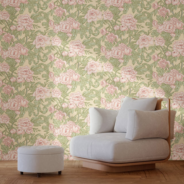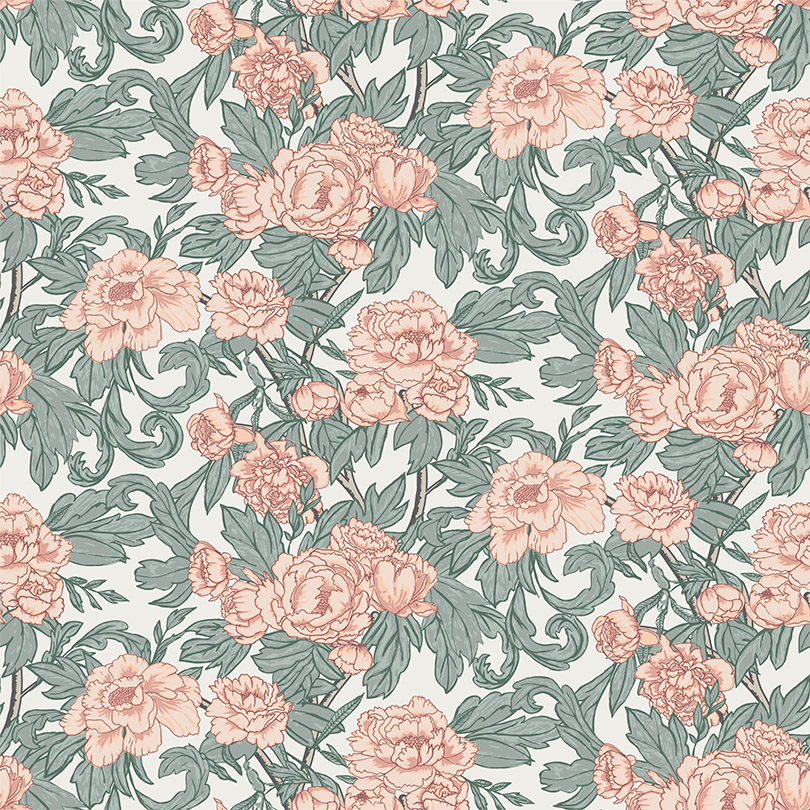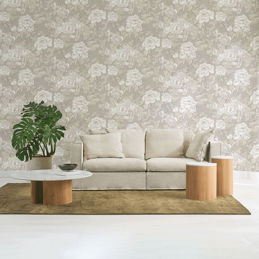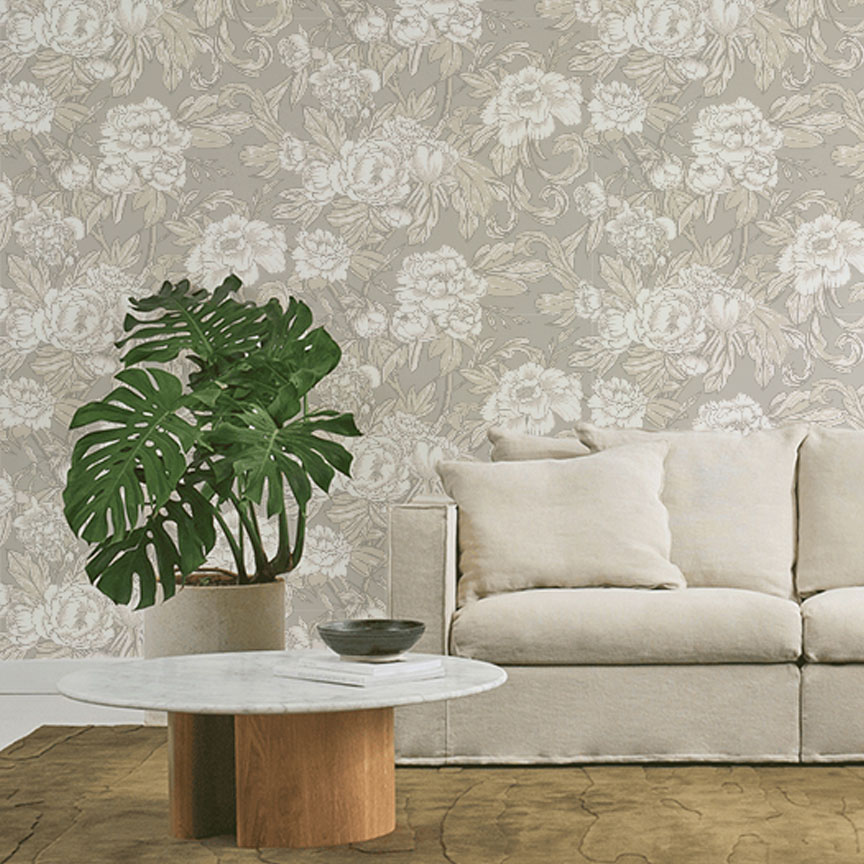 Inspired by classic botanical illustrations, Peace Peony Wallpaper showcases lush peony flowers intertwined with sweeping leaves and organic movement. The generous scale of the blooms and the fluid rhythm of the pattern create a sense of calm sophistication, making it both decorative and effortlessly livable.