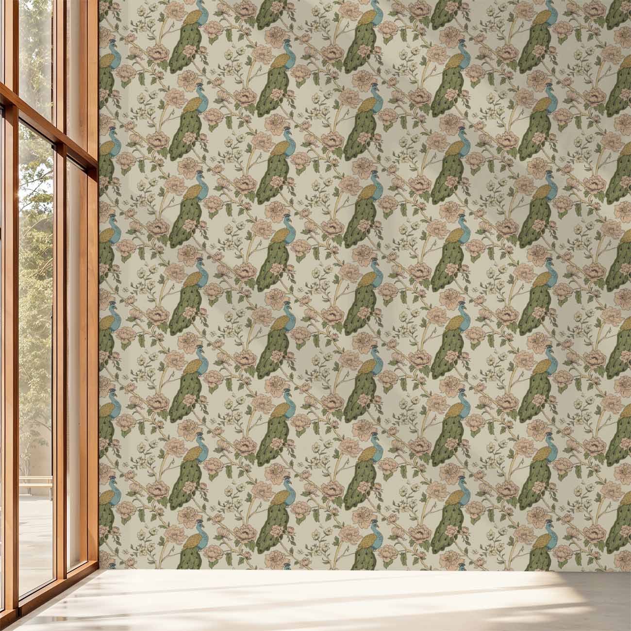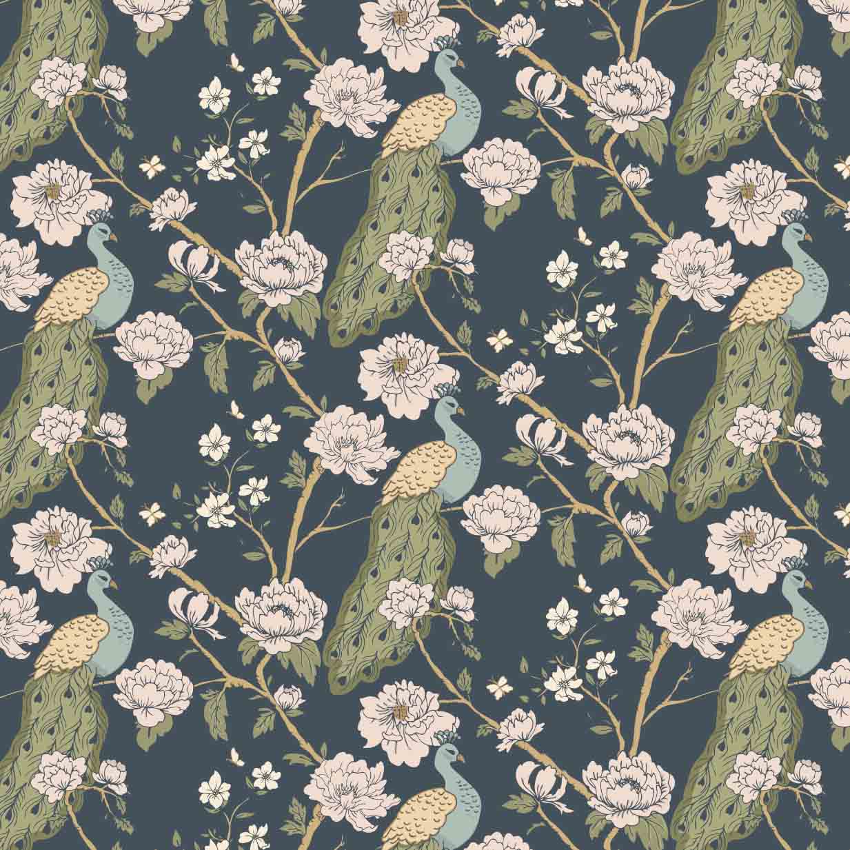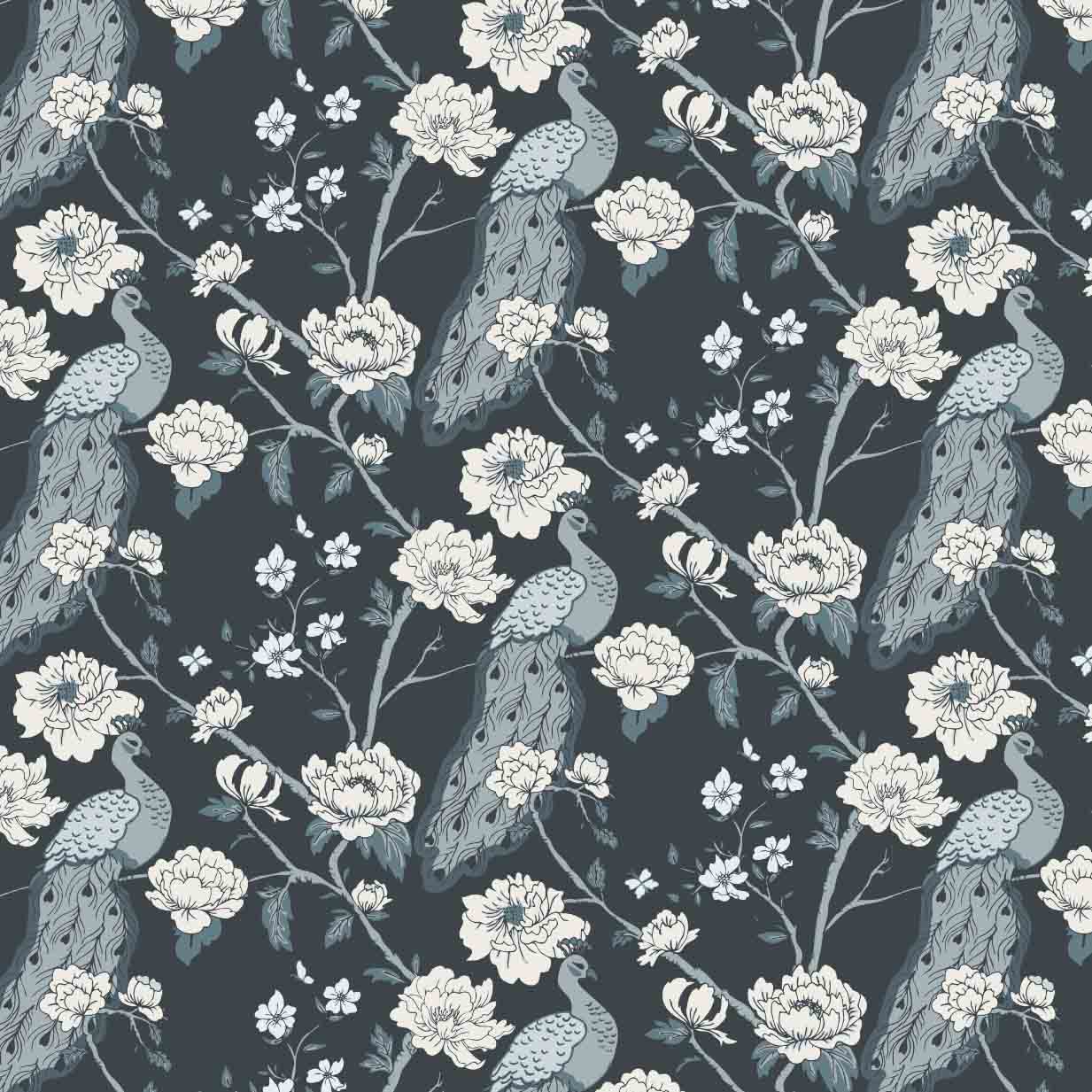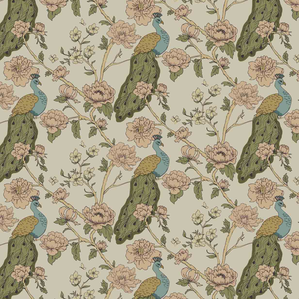 Peacock Chinoise Wallpaper blends ornamental florals with graceful peacocks to create a pattern that feels both historic and sophisticated. Flowing branches, layered blossoms, and finely illustrated birds are arranged in a balanced repeat that adds visual interest without overwhelming a space. The design offers a sense of movement and romance, drawing the eye while maintaining harmony.