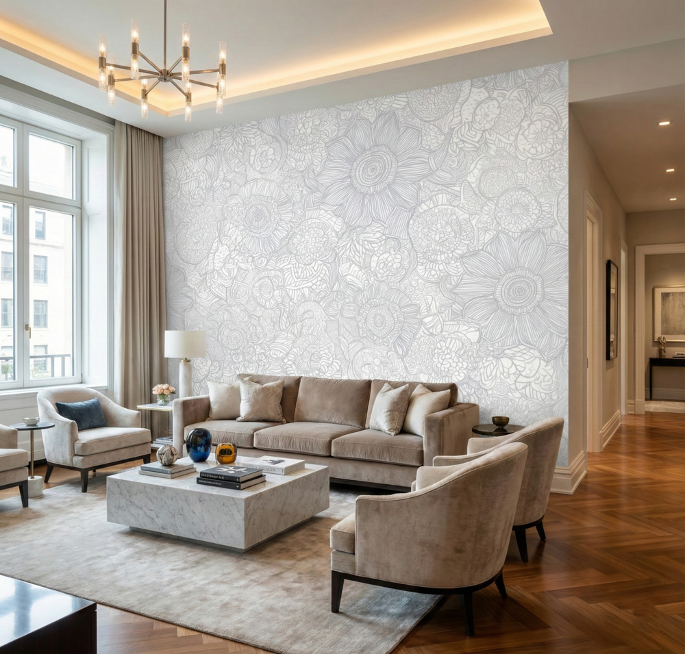 From afar, the mural reads as a soft, textured white wall, but up close, it reveals a mesmerizing tapestry of botanical sketches. The ethereal, low-opacity linework adds intricate texture without causing visual clutter. It is an exceptional feature piece for a serene master bedroom, a bright and airy living room, or a sophisticated nursery where texture is desired without heavy color.
