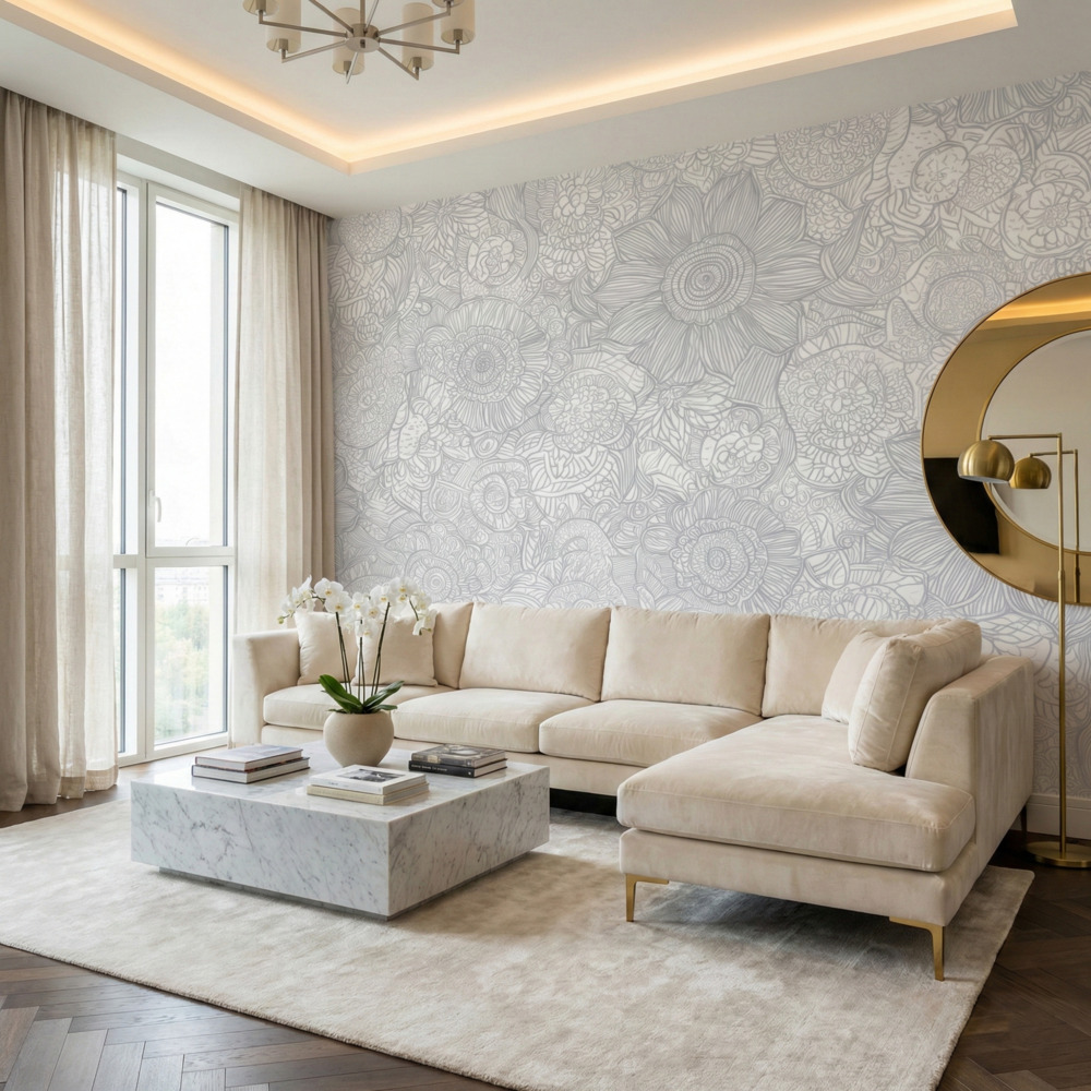 Elevate your space with the barely-there beauty of the Pearl Filigree Floral Mural. This stunning wall mural offers the perfect compromise between minimalist neutrality and maximalist detail. The artwork consists of incredibly detailed, zentangle-inspired floral shapes, overlapping petals, and organic line art, all rendered in an ultra-low-contrast, frosty silver-grey palette.