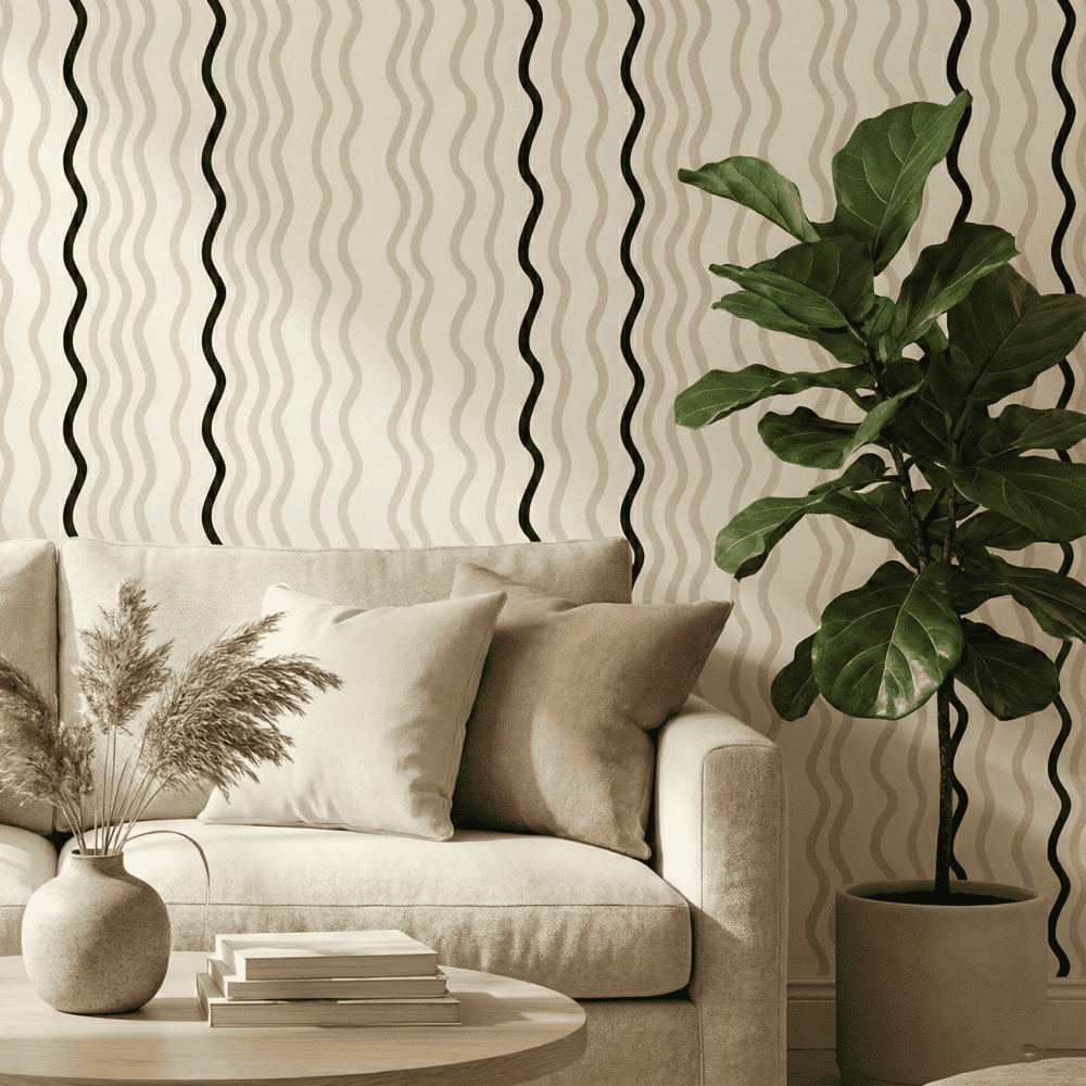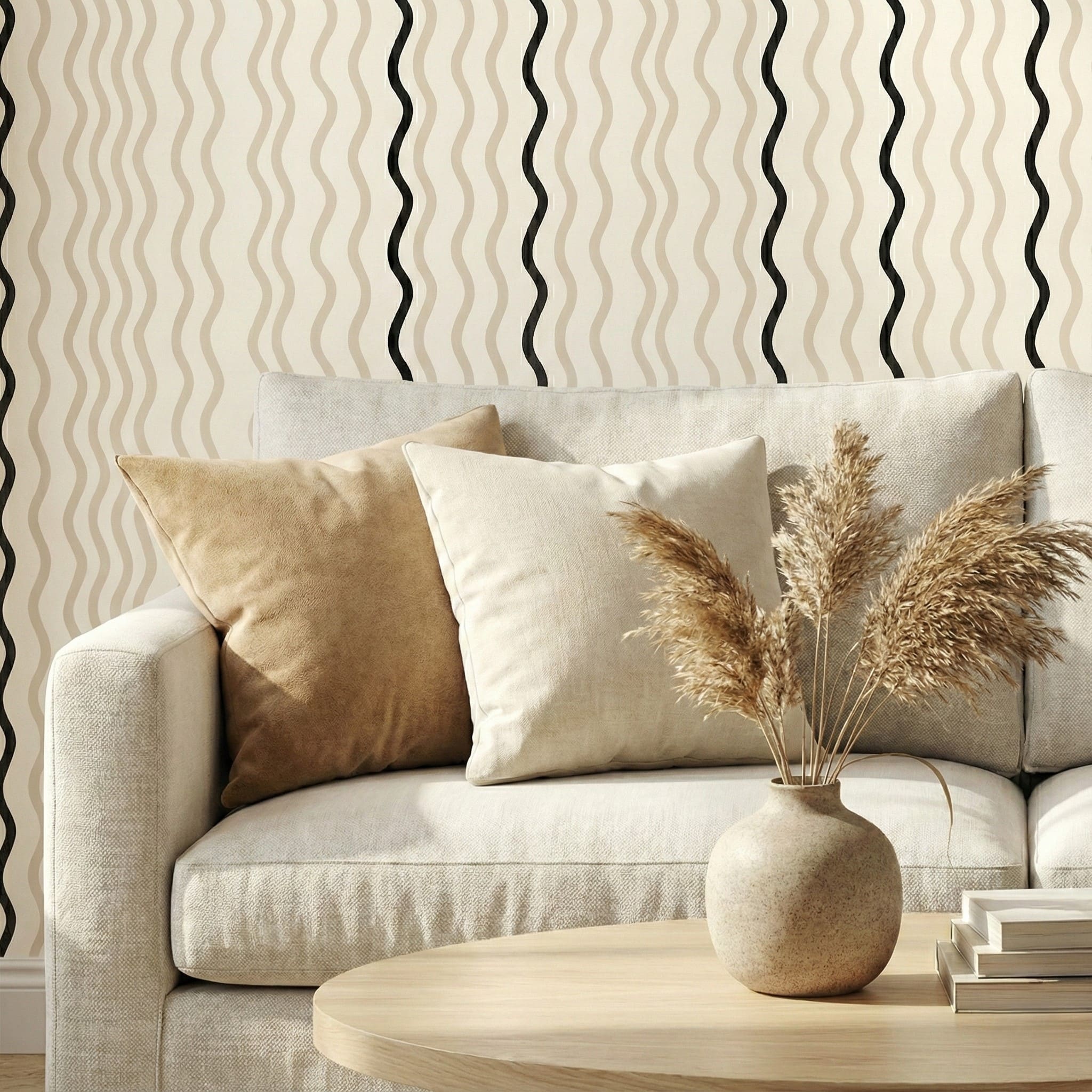 This vertical orientation is an excellent choice for making ceilings appear higher and rooms feel more spacious. Unlike rigid straight lines, the fluid wave pattern introduces a calming sense of movement, making it perfect for spaces where relaxation is key, such as living rooms or bedrooms. The neutral palette of cream, tan, and black ensures it pairs effortlessly with various design stylesโ€”from Mid-Century Modern and Scandinavian to Contemporary and Bohemian.