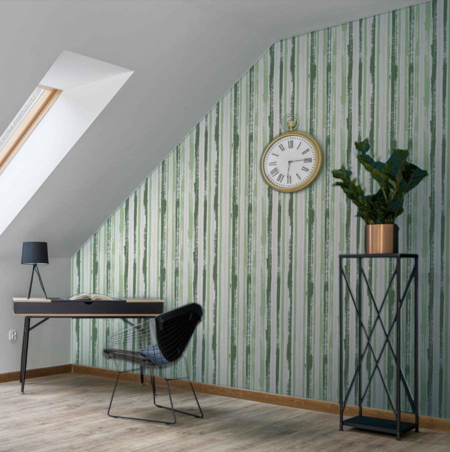 *Safari Gouache Stripes Wallpaper* brings nature indoors with lush greens and organic textures. This forest-inspired peel & stick mural is made in Canada, waterproof, removable, and ideal for rentals. Printed on a canvas-textured finish, it’s perfect for bathrooms, bedrooms, or meditation spaces – high-end design, low price.
