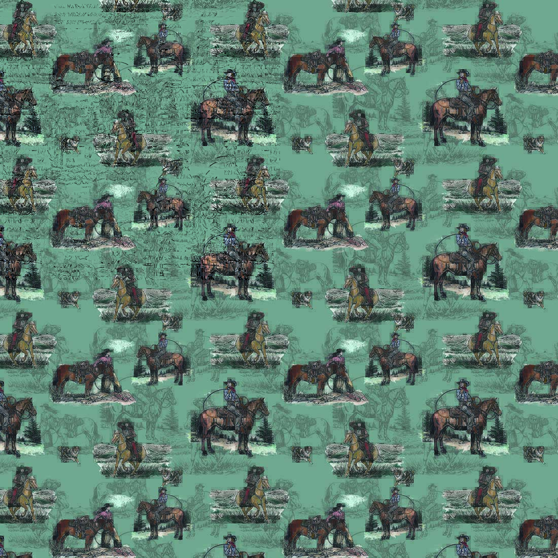 Sage & Saddle Turquoise Wallpaper brings classic western storytelling to the wall with a vibrant turquoise background and detailed cowboy riding scenes. The design features riders, horses, and quiet ranch moments illustrated in a vintage-inspired style that feels both nostalgic and modern.