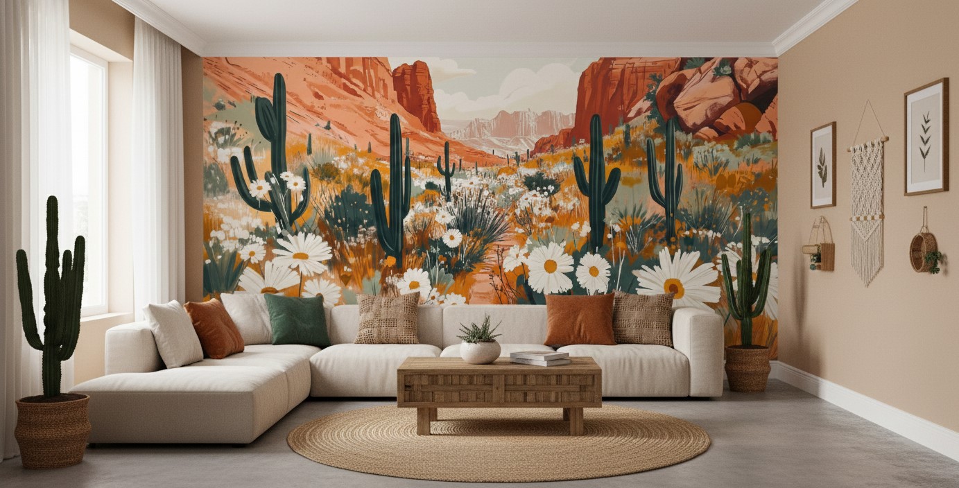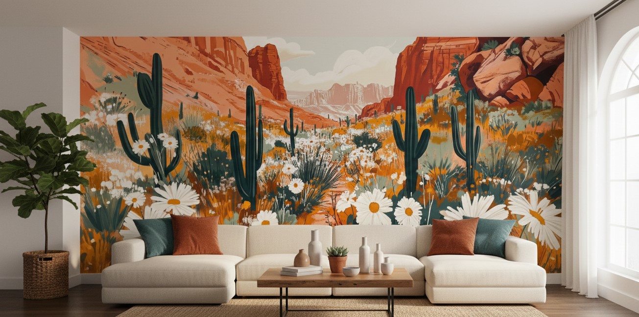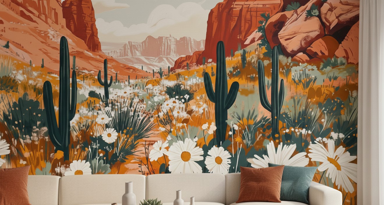 Bring the majestic beauty of the American Southwest into your home with the Saguaro Canyon Bloom Mural. This sprawling landscape scene captures a lively desert floor in full bloom, where large white and yellow daisies mingle with tall, iconic saguaro cacti. In the background, towering red rock formations and canyon walls are bathed in warm, terracotta and orange hues, leading the eye under a soft, cloudy sky.