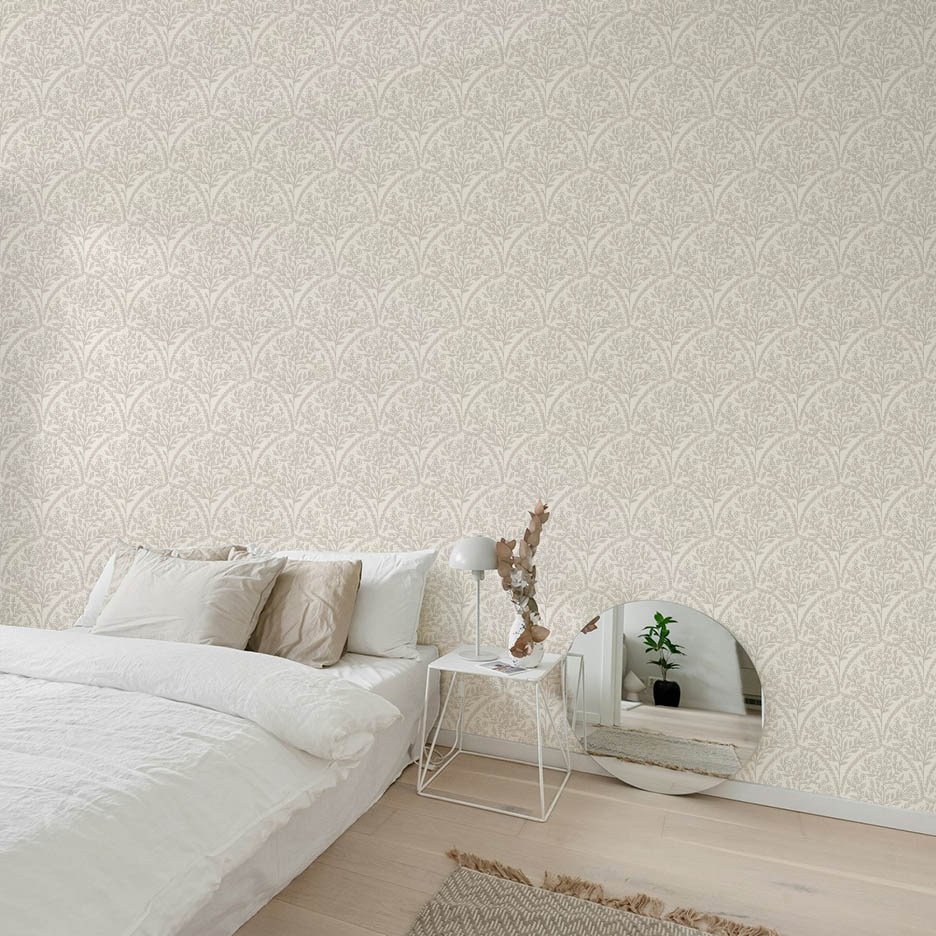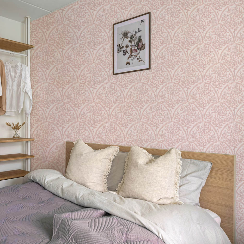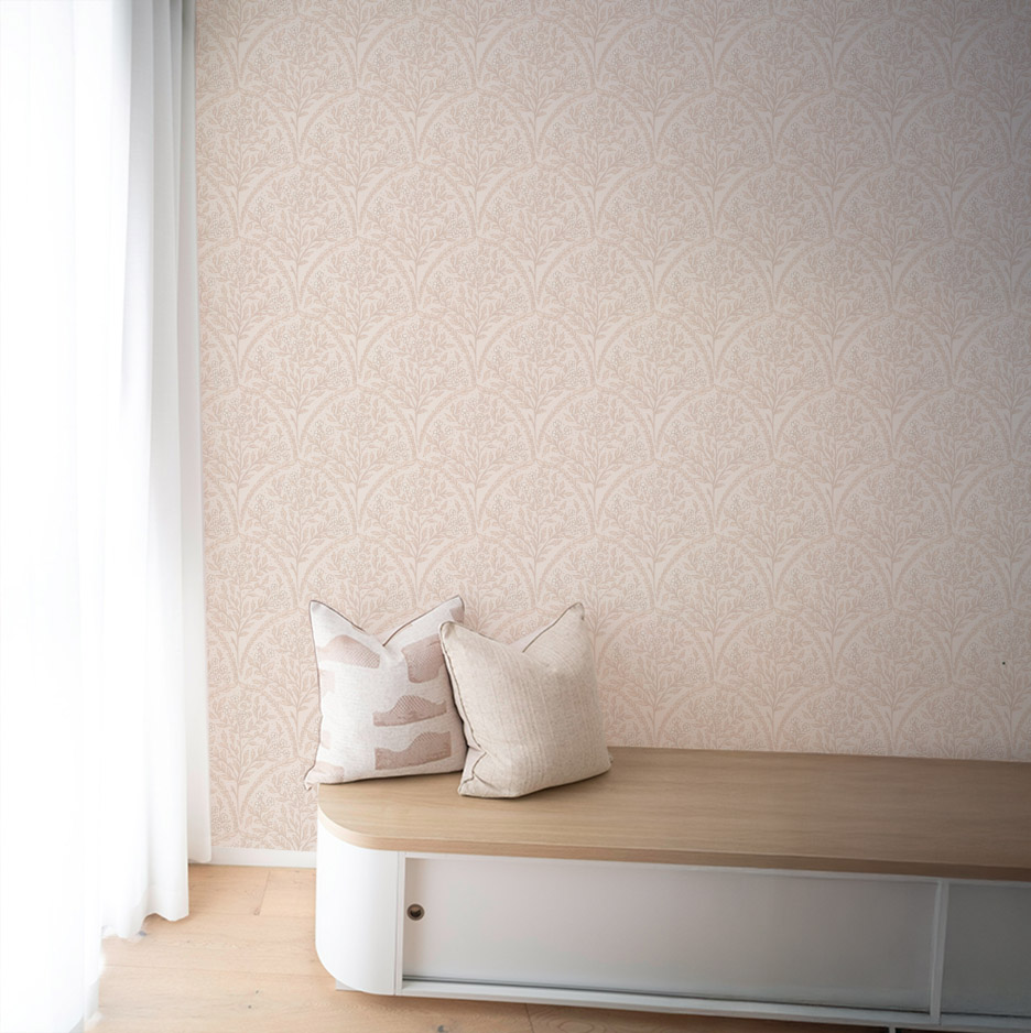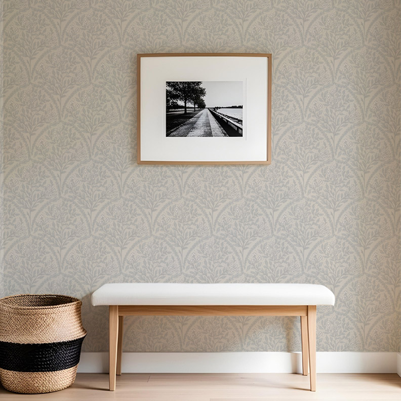 Our Scalloped Floral Wallpaper brings graceful elegance into any interior. With arch-like scallops cradling intricate floral vines, this pattern evokes a vintage botanical feel with contemporary clarity. The light and airy design works effortlessly in bedrooms, cozy corners, entryways, or calm living areas. Whether you choose the soft blush pink, tranquil teal, or classic neutral tones, this wallpaper adds warmth and style without overpowering your space. Made to order in your exact dimensions and available in peel & stick or traditional materials, this design adapts beautifully to modern life while celebrating timeless detail.