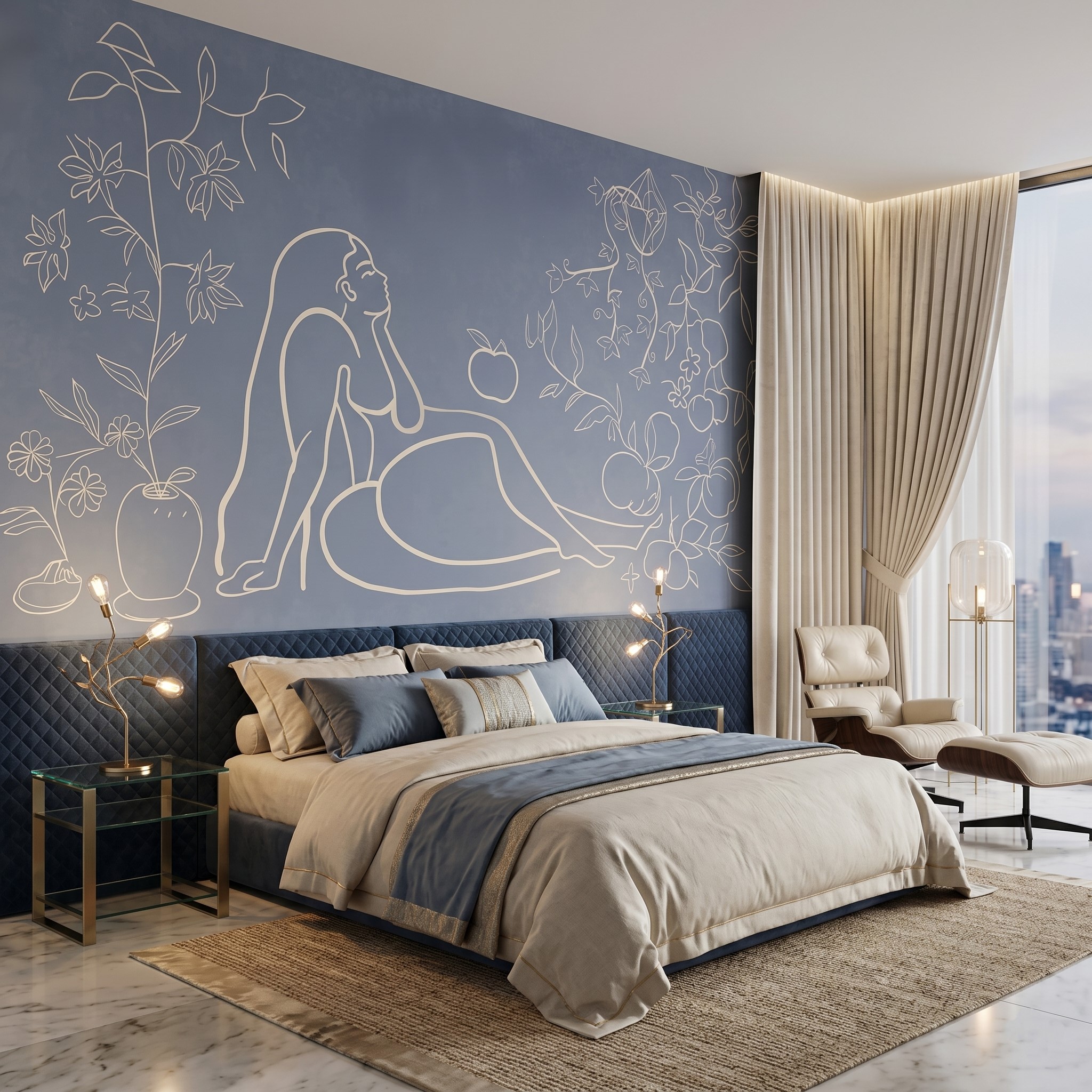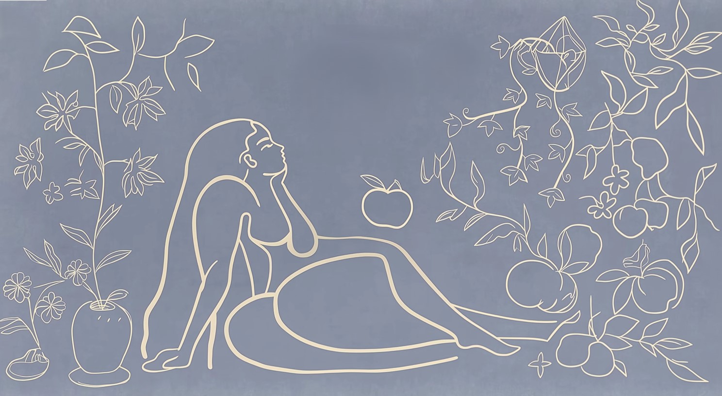 Elevate your interior with the Serene Muse Mural, a stunning blend of classical grace and modern minimalism. This artwork utilizes fluid, continuous line-work to depict a reclining figure surrounded by whimsical floral vines, floating fruit, and delicate blossoms. The monochromatic cream linework creates a striking yet soft contrast against the muted, textured slate-blue canvas, offering a serene focal point that doesn’t overwhelm the room.