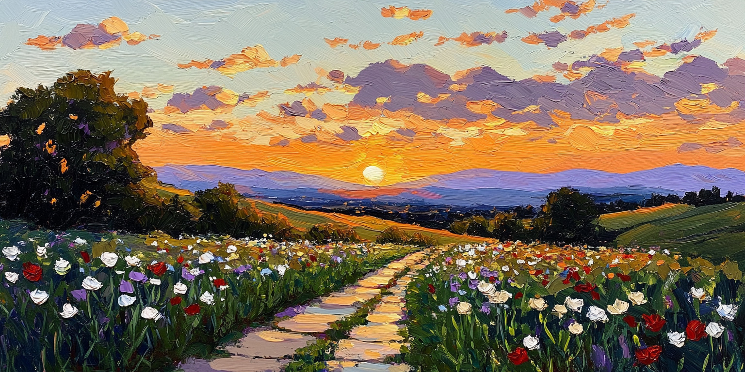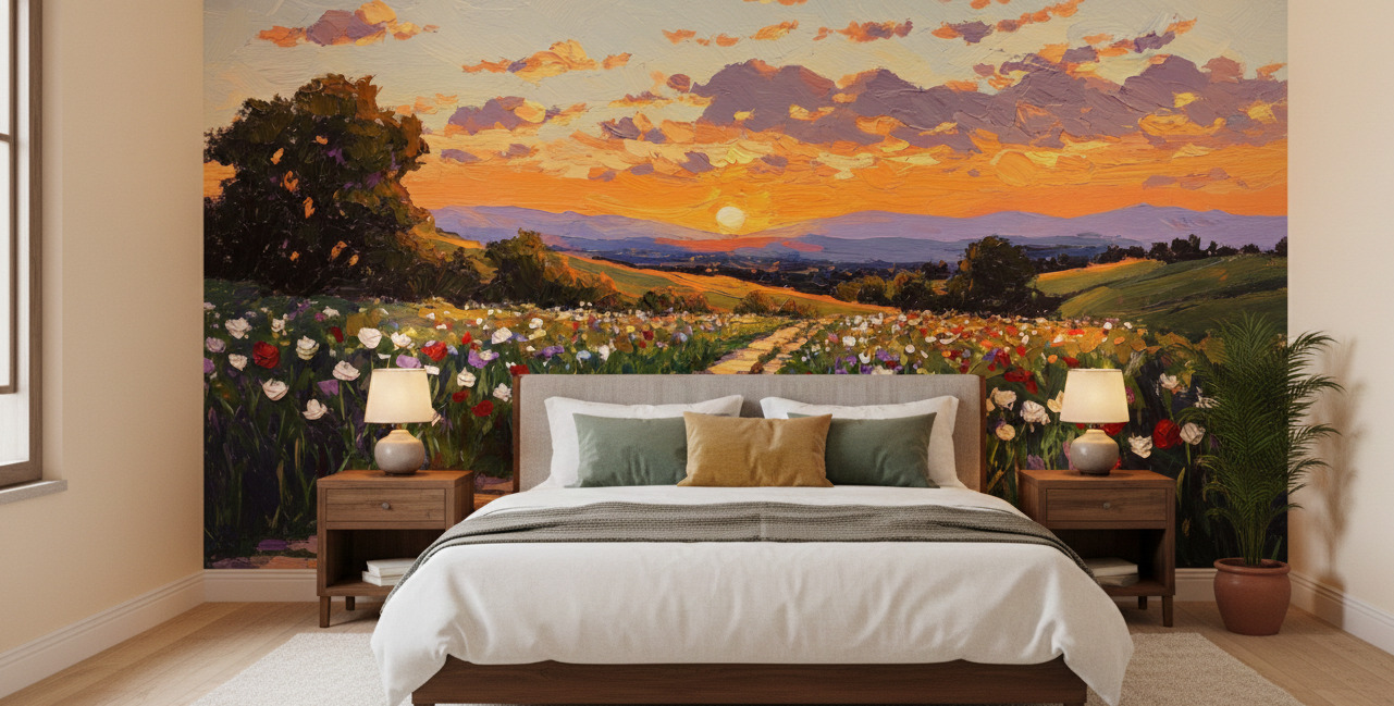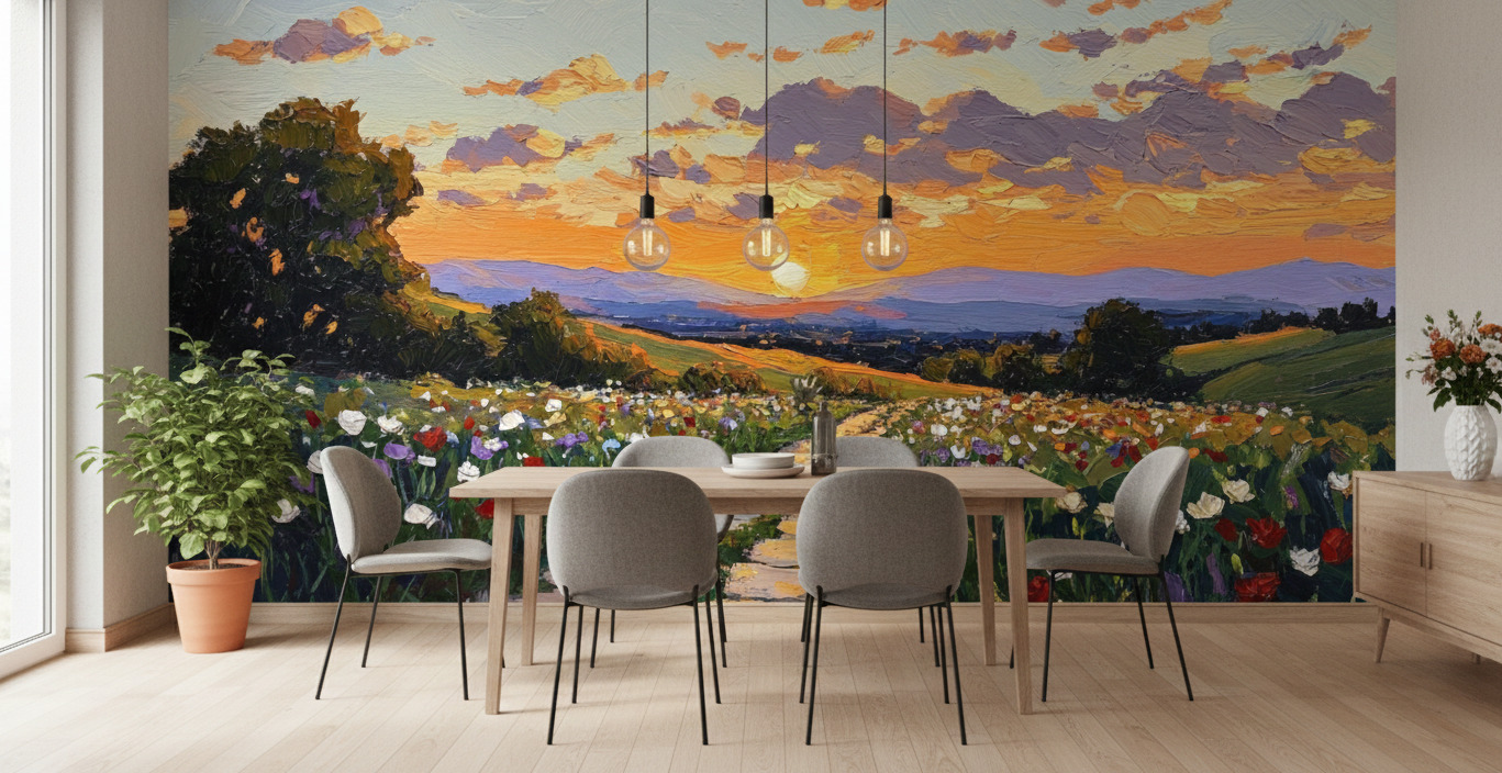 Transform your wall into a masterpiece with the Sunset Wildflower Path Mural. Capturing the fleeting beauty of the “golden hour,” this mural depicts a rustic stone path leading toward a horizon ablaze with the fiery hues of a setting sun. The foreground is alive with a riot of red, white, and blue wildflowers, painted with bold, expressive brushstrokes that mimic the texture of thick oil paint (impasto).