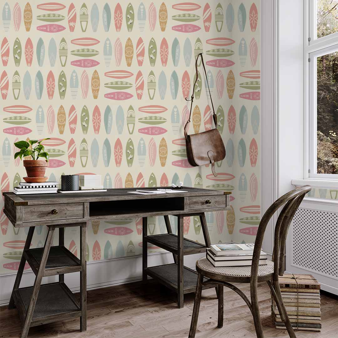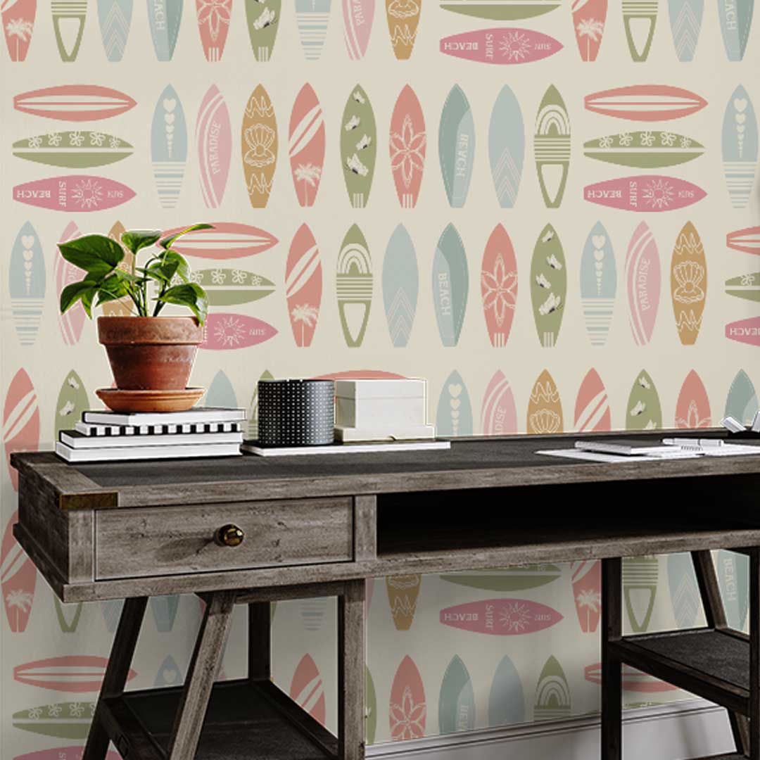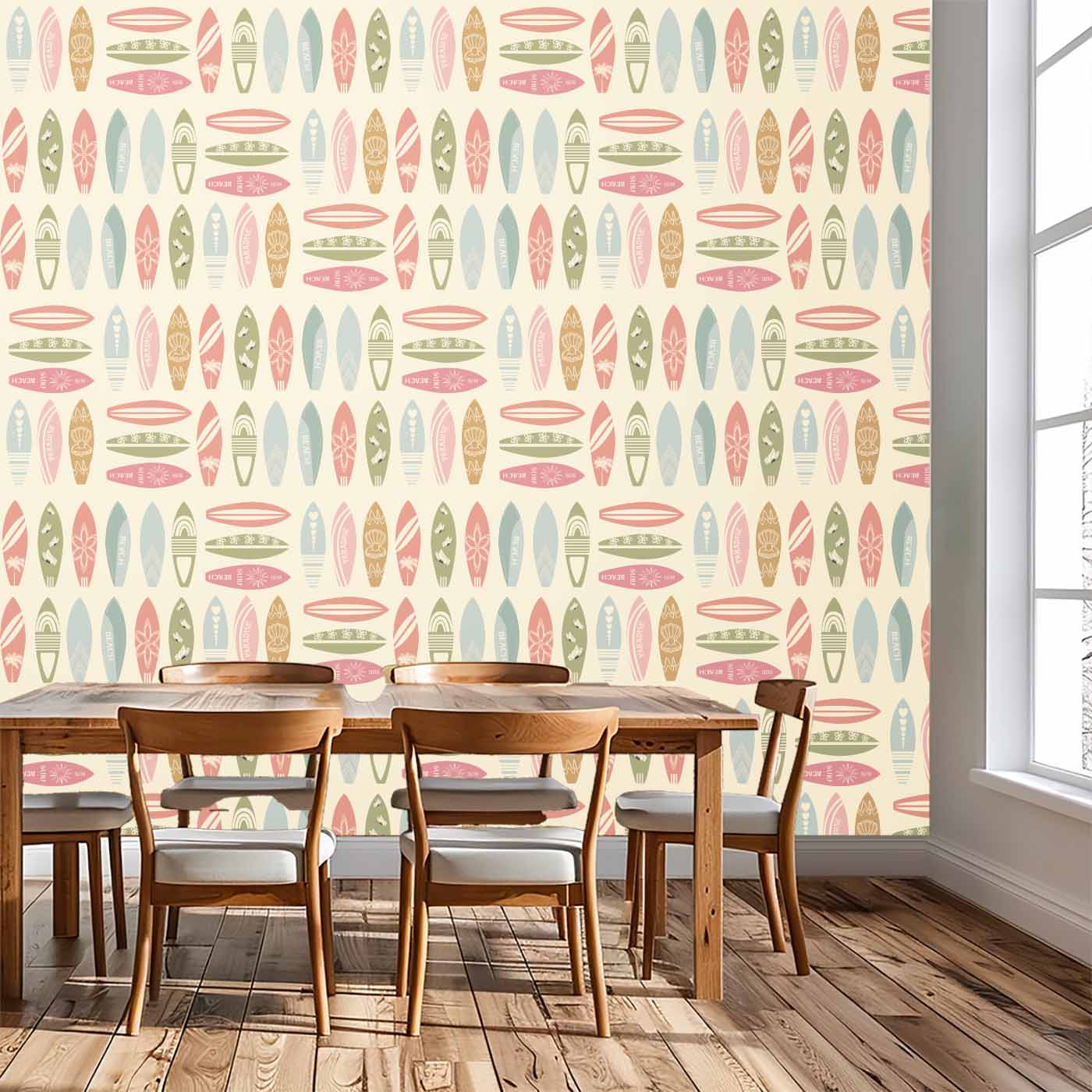 Bring the laid-back lifestyle of the coast into your space with our Surfing Wallpaper. This design showcases an eclectic mix of vintage-inspired surfboards in muted pastel tones of coral, sage, and blue on a warm cream background. The hand-drawn style evokes mid-century beach nostalgia, ideal for boho interiors, surfer bedrooms, or creative home offices. Whether you’re decorating a coastal-themed Airbnb or adding character to your dining area, this wallpaper delivers effortless charm. Available in peel & stick or traditional wallpaper options, it’s a breeze to install and remove. Make waves with this fun, timeless wall statement.