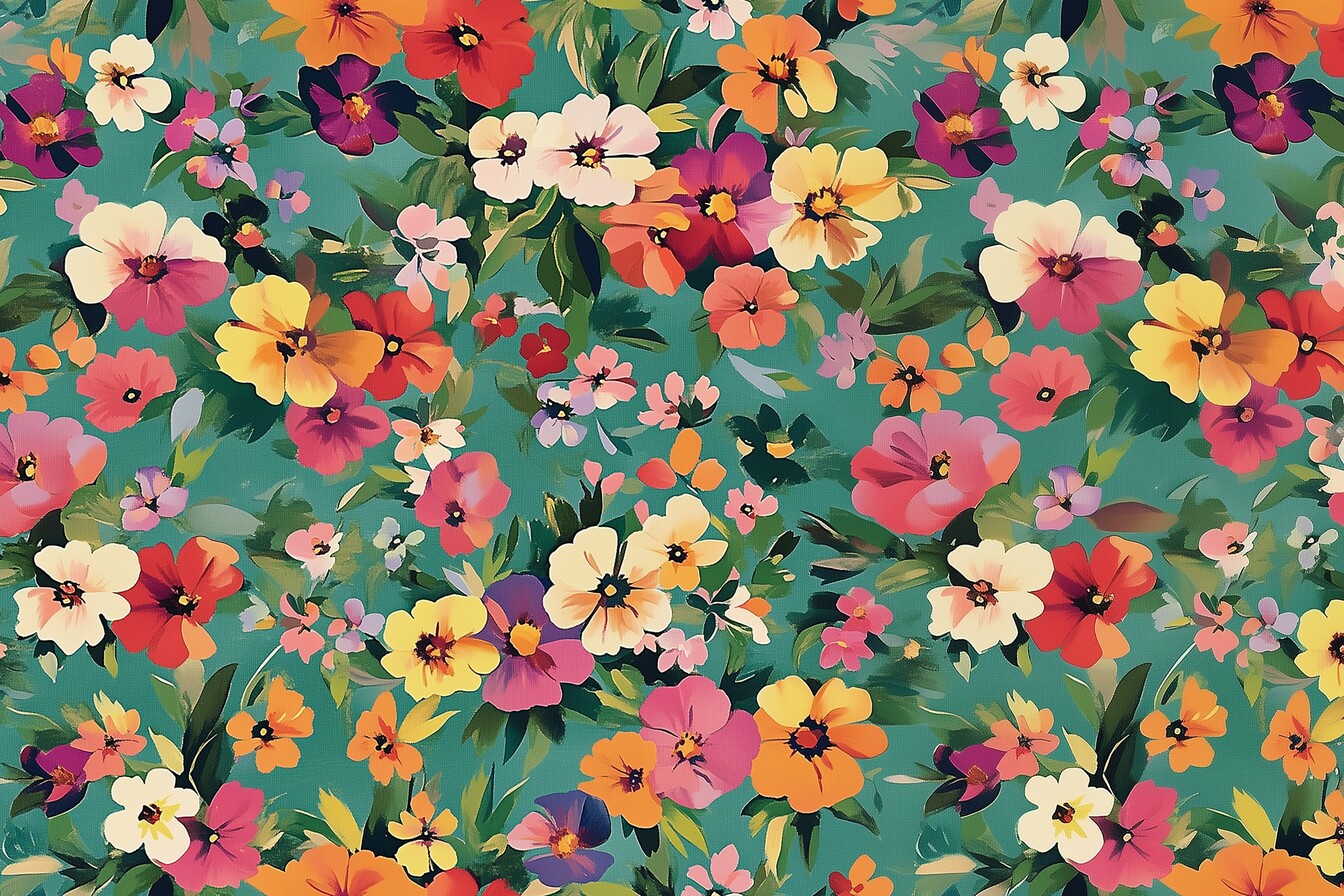 Transform your space into a perpetual spring sanctuary with the Teal Garden Mural. This vibrant artwork reads like a large-scale painted masterpiece for your walls, moving away from rigid patterns into fluid, artistic expression. The design features a dense, lush arrangement of wildflowers—including sun-drenched yellows, fiery oranges, deep purples, soft pinks, and creamy whites—all popping against a stunning, deep teal canvas. The style is distinctly painterly, with visible brushstrokes and a rich texture that gives the botanicals a sense of movement and life.