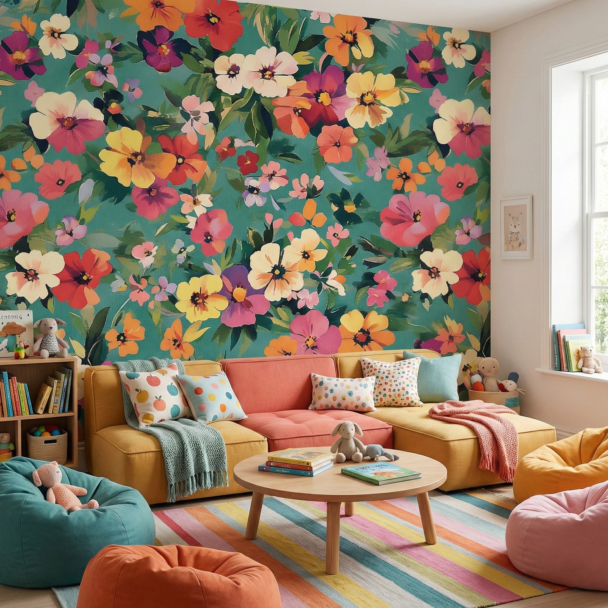 This mural is designed to be a showstopping feature wall that instantly lifts the mood of a room. It works exceptionally well in bohemian bedrooms, lively living areas, or creative home offices that require a burst of energy and color. The diverse palette allows for versatile styling; pair it with natural rattan furniture for a boho-chic look, or velvet upholstery to enhance the luxurious feel of the painted flowers. Available for delivery across the USA, Canada, and South Africa, this mural brings the untamed beauty of an artistic garden directly into your contemporary home.