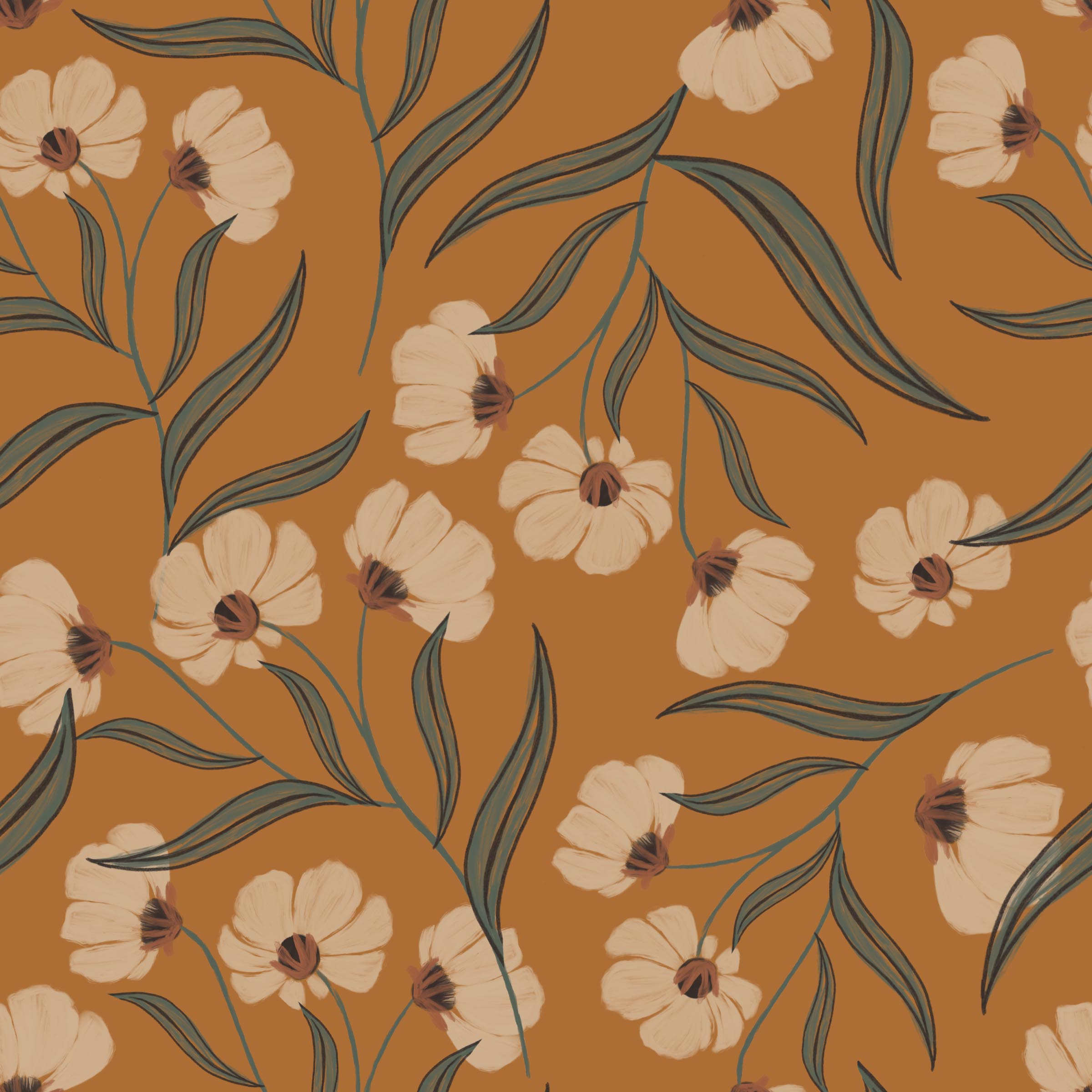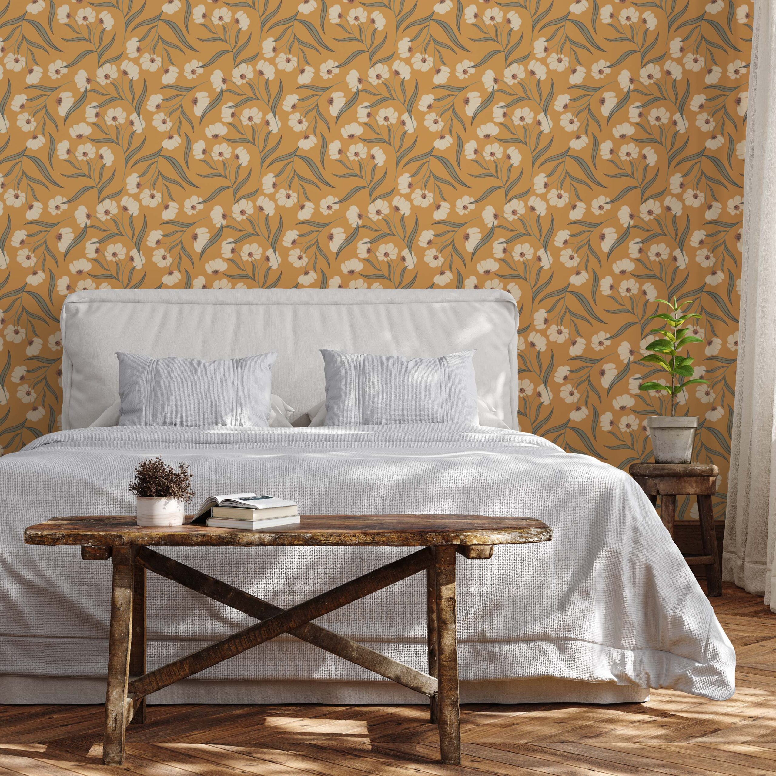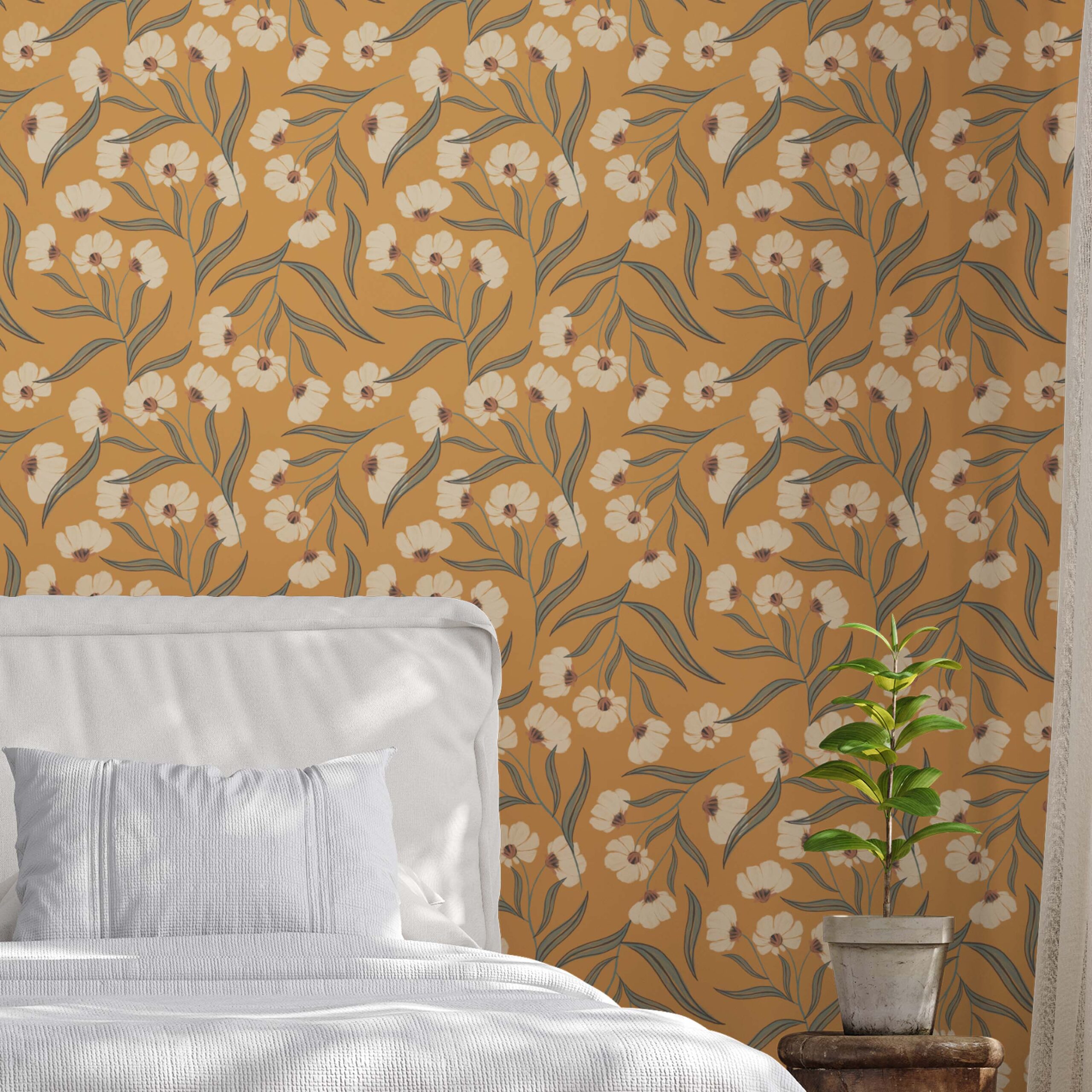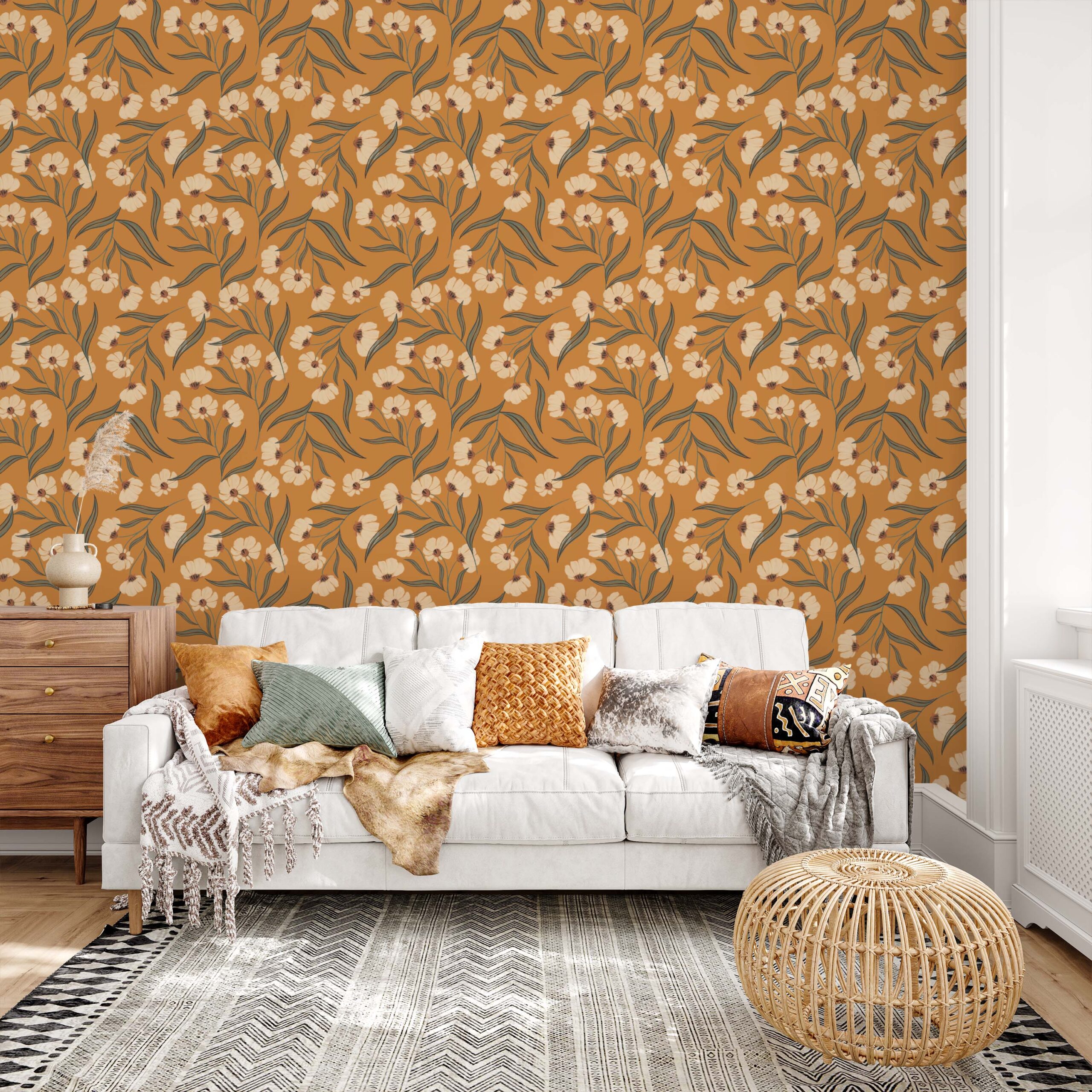 Sun-Baked Blooms with Terracotta Floral Wallpaper – Invite warmth and artisanal charm into your space with this boho peel and stick wallpaper. The design features stylized off-white blossoms with sage green leaves dancing over a rich terracotta background, evoking sunlit desert blooms. Ideal for bedrooms, lounges, or creative spaces craving a cozy, handcrafted vibe. Printed on durable, removable, and renter-safe materials, it’s a perfect statement for modern bohemian interiors.