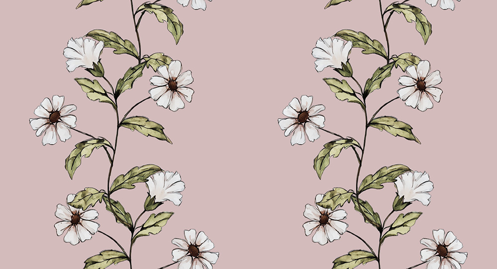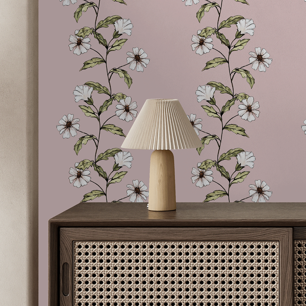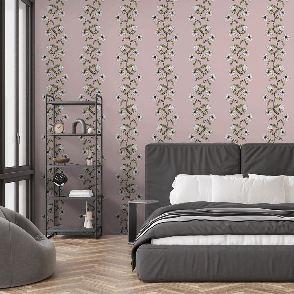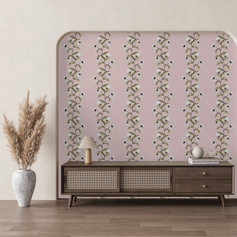 Soft Botanical Drama with Trailing Flowers in Jaipur Pink – This peel and stick wallpaper brings warmth and whimsy to your walls with its charming pattern of hand-drawn white flowers climbing in soft vertical vines. Set against a Jaipur pink background, the look is romantic yet structured perfect for bedrooms, living rooms, or accent alcoves. Printed on removable, commercial-grade wallpaper, it’s a renter-friendly solution that’s washable, repositionable, and designed to transform any space with elegance and ease.