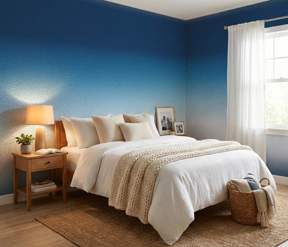 Unlike standard flat color gradients, this wallpaper is elevated by a sophisticated faux-texture finish. The visual grainโresembling high-quality stippled paper or a plastered wallโadds significant physical depth and softness, preventing the wall from looking stark or digitally printed. This texture catches the light subtly, giving the colour transition a vibrant, living quality.