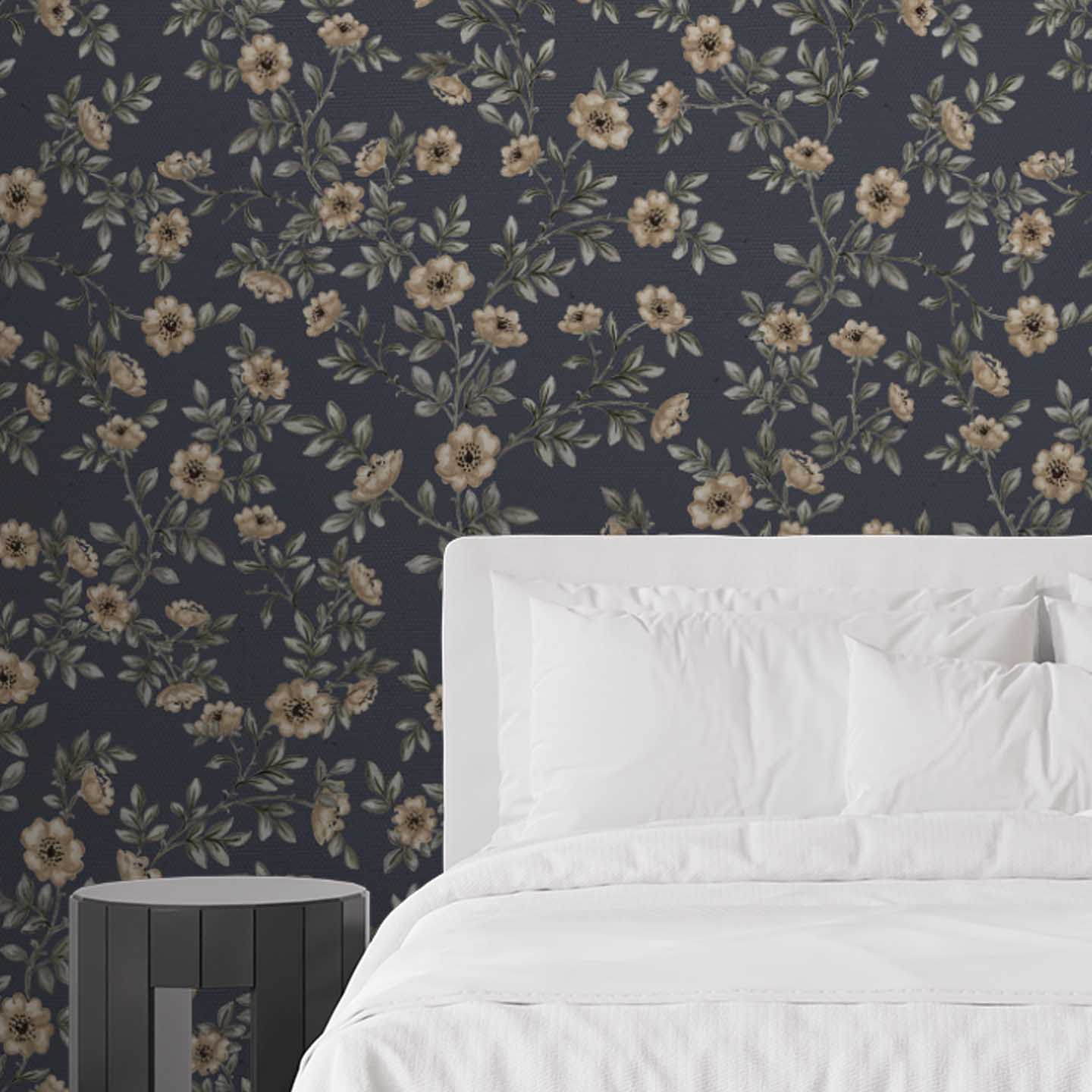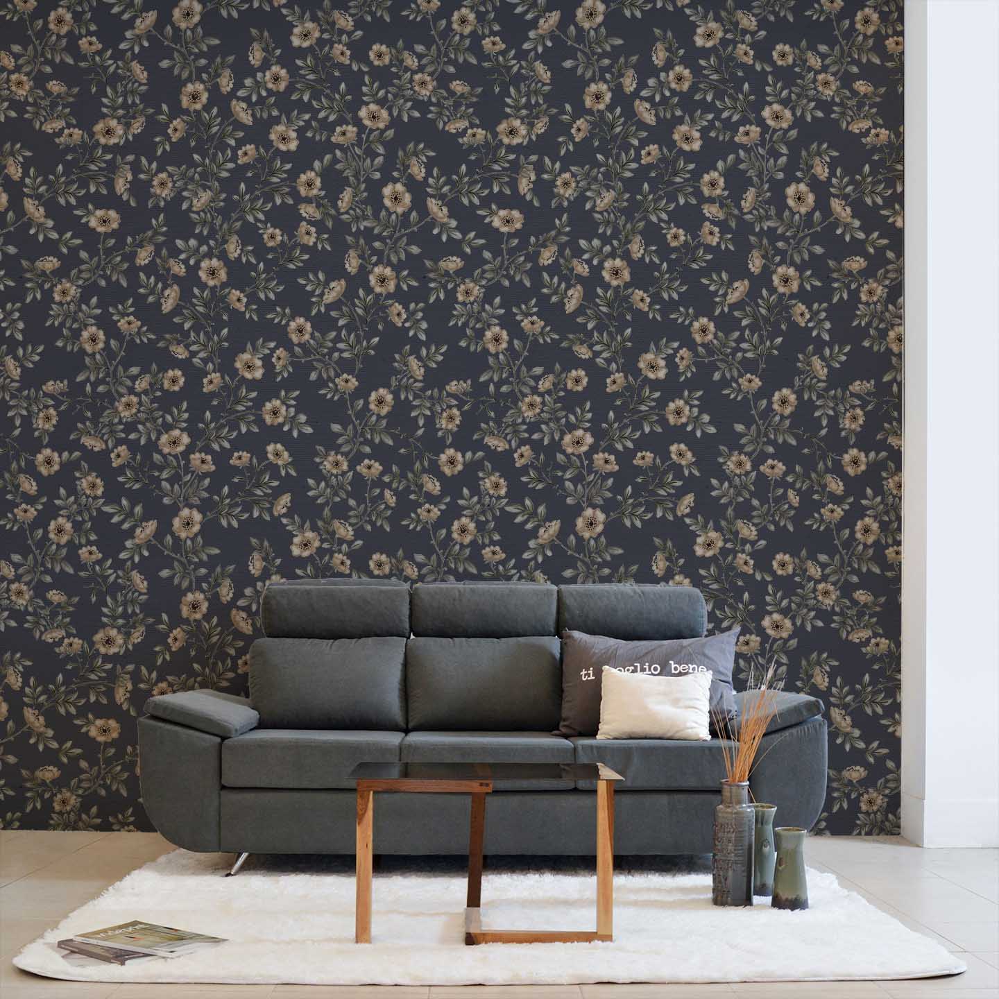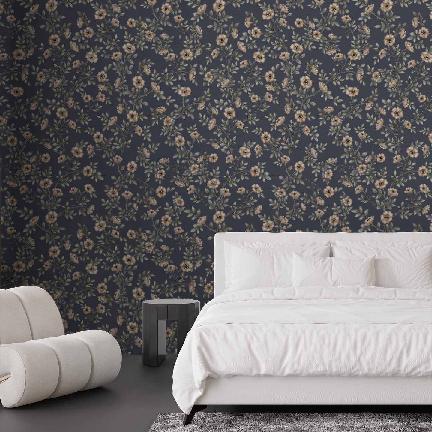 Inspired by classic botanical textiles, this pattern balances traditional elegance with modern styling—making it ideal for bedrooms, living rooms, and statement walls. The darker base creates a cocooning effect, while the lighter florals keep the design airy and inviting.