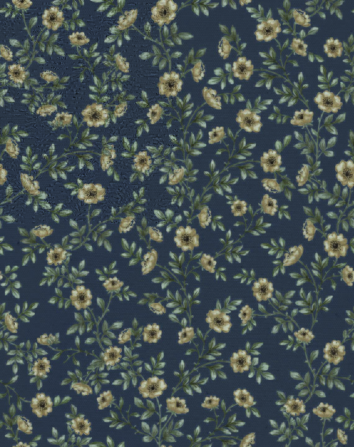 Bring depth, warmth, and heritage-inspired beauty into your space with this vintage rose vine wallpaper. The design features intricately illustrated cream blossoms intertwined with soft green foliage, gracefully layered over a deep navy backdrop for a rich, sophisticated look.