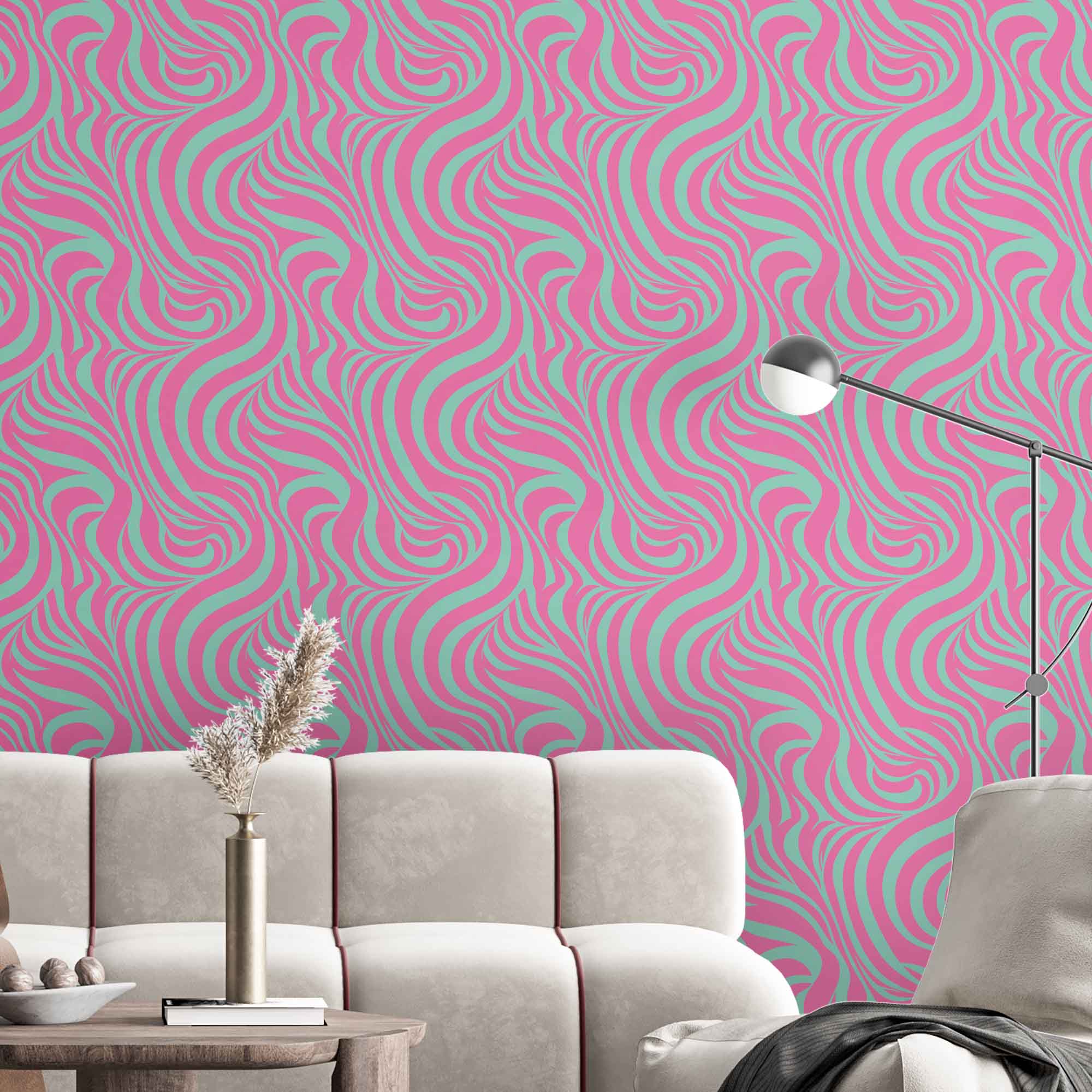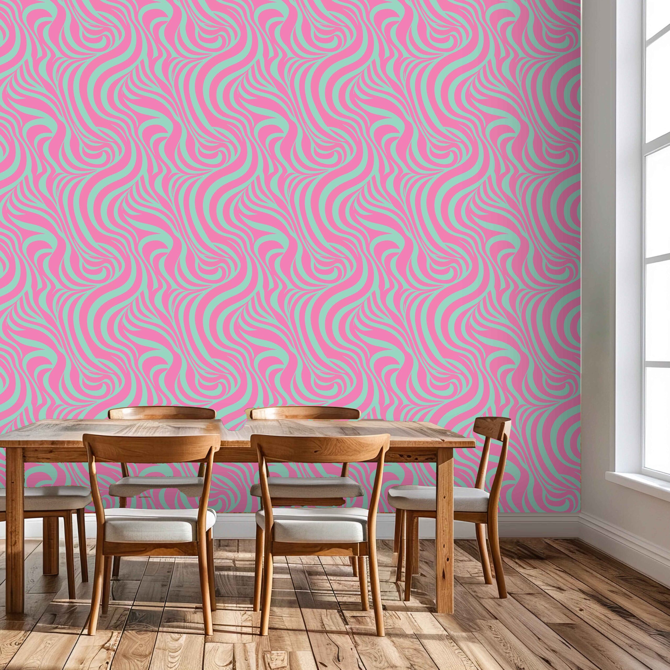 Wild Times Wallpaper – Vibrant 70s-Inspired Movement in Pastel Pink and Mint – Step into a groovy escape with this bold peel and stick wallpaper. The dynamic wave pattern recalls retro roller rinks and funky pop art in perfectly balanced shades of bubblegum pink and mint green. Ideal for statement walls in living rooms, dining spaces, or playful studios. Printed on high-quality removable vinyl that’s washable and easy to reposition, this wallpaper lets you embrace wild design—without commitment.